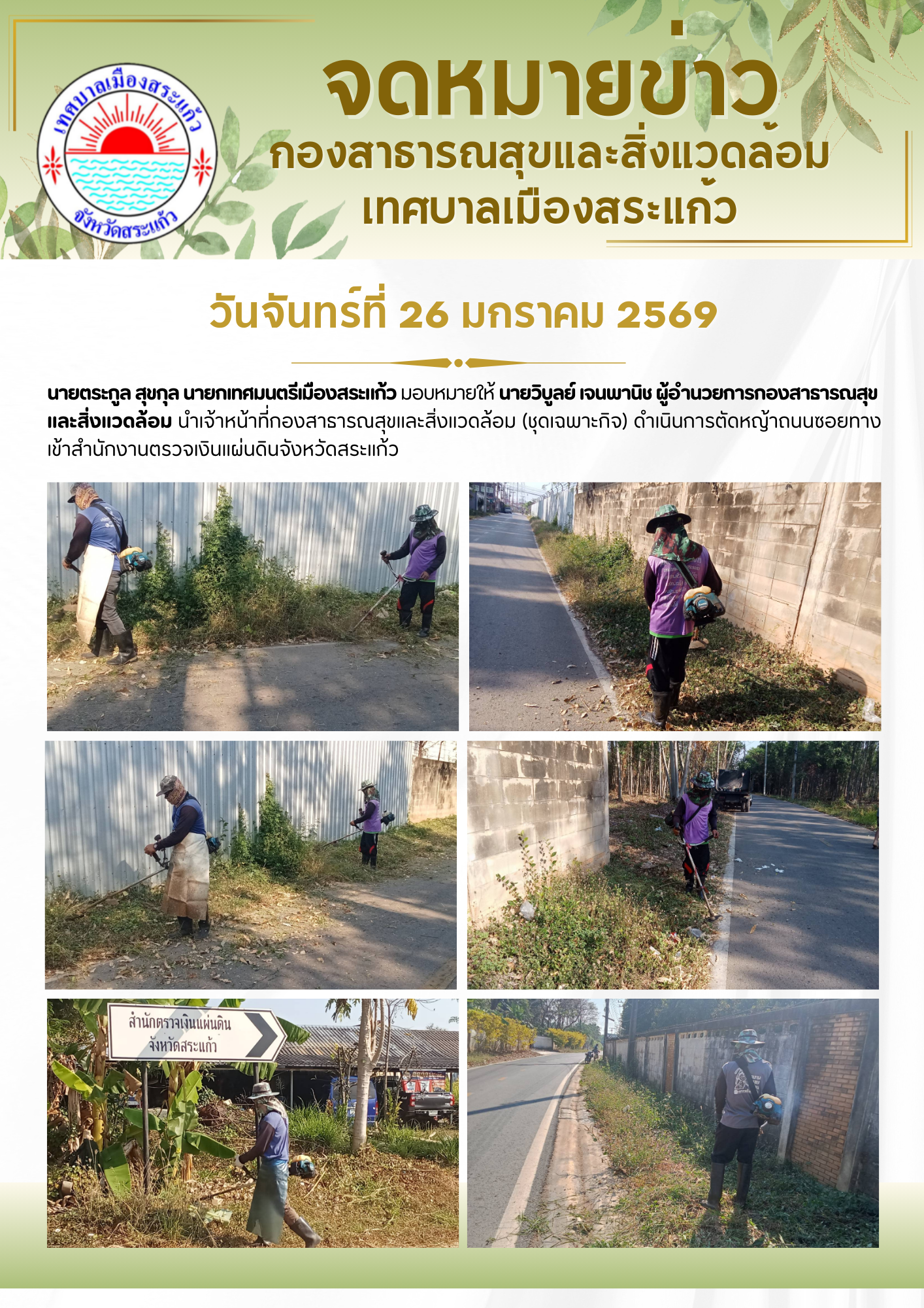 (26 ม.ค. 69) นายตระกูล สุขกุล นายกเทศมนตรีเมืองสระแก้ว มอบหมายให้นายวิบูลย์ เจนพานิช ผู้อำนวยการกองสาธารณสุขและสิ่งแวดล้อม นำเจ้าหน้าที่กองสาธารณสุขและสิ่งแวดล้อม (ชุดเฉพาะกิจ) ดำเนินการตัดหญ้าถนนซอยทางเข้าสำนักงานตรวจเงินแผ่นดินจังหวัดสระแก้ว