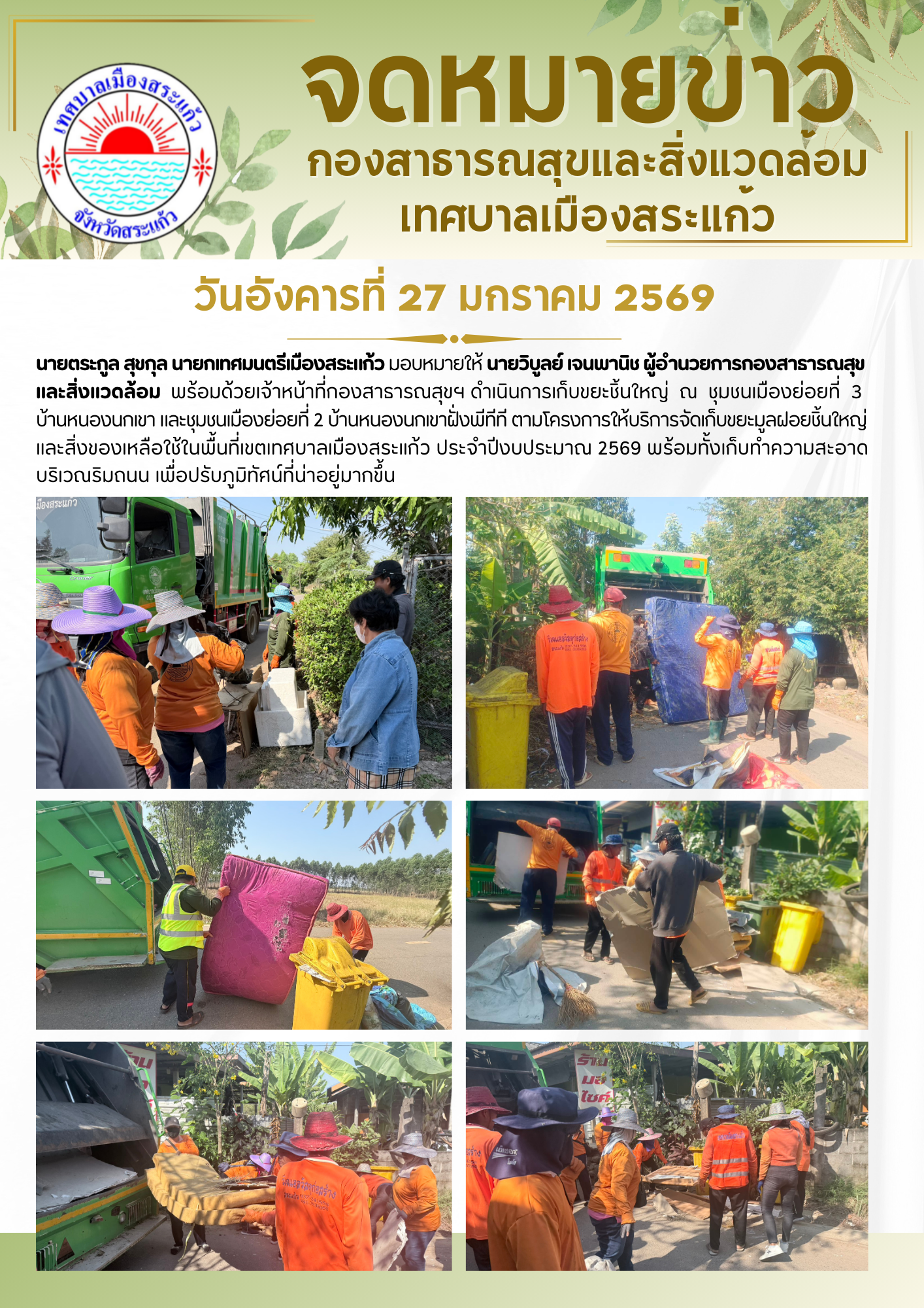 (27 ม.ค. 69) นายตระกูล สุขกุล นายกเทศมนตรีเมืองสระแก้ว มอบหมายให้นายวิบูลย์ เจนพานิช ผู้อำนวยการกองสาธารณสุขและสิ่งแวดล้อม พร้อมด้วยเจ้าหน้าที่กองสาธารณสุขและสิ่งแวดล้อม ดำเนินการเก็บขยะชิ้นใหญ่ ณ ชุมชนเมืองย่อยที่ 3 (บ้านหนองนกเขา) และชุมชนเมืองย่อยที่ 2 (บ้านหนองนกเขาฝั่งพีทีที) ตามโครงการให้บริการจัดเก็บขยะมูลฝอยชิ้นใหญ่และสิ่งของเหลือใช้ในพื้นที่เขตเทศบาลเมืองสระแก้ว ประจำปีงบประมาณ 2569 พร้อมทั้งเก็บทำความสะอาดบริเวณริมถนน เพื่อปรับภูมิทัศน์ที่น่าอยู่มากขึ้น