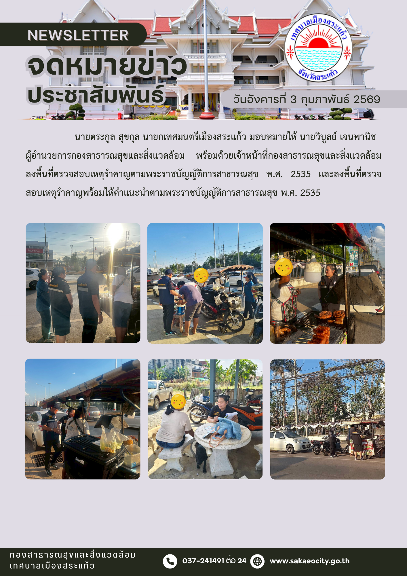 (3 ก.พ. 69) นายตระกูล สุขกุล นายกเทศมนตรีเมืองสระแก้ว มอบหมายให้นายวิบูลย์ เจนพานิช ผู้อำนวยการกองสาธารณสุขและสิ่งแวดล้อม พร้อมด้วยเจ้าหน้าที่กองสาธารณสุขและสิ่งแวดล้อม ลงพื้นที่ตรวจสอบเหตุรำคาญตามพระราชบัญญัติการสาธารณสุข พ.ศ. 2535 และลงพื้นที่ตรวจสอบเหตุรำคาญพร้อมให้คำแนะนำตามพระราชบัญญัติการสาธารณสุข พ.ศ. 2535