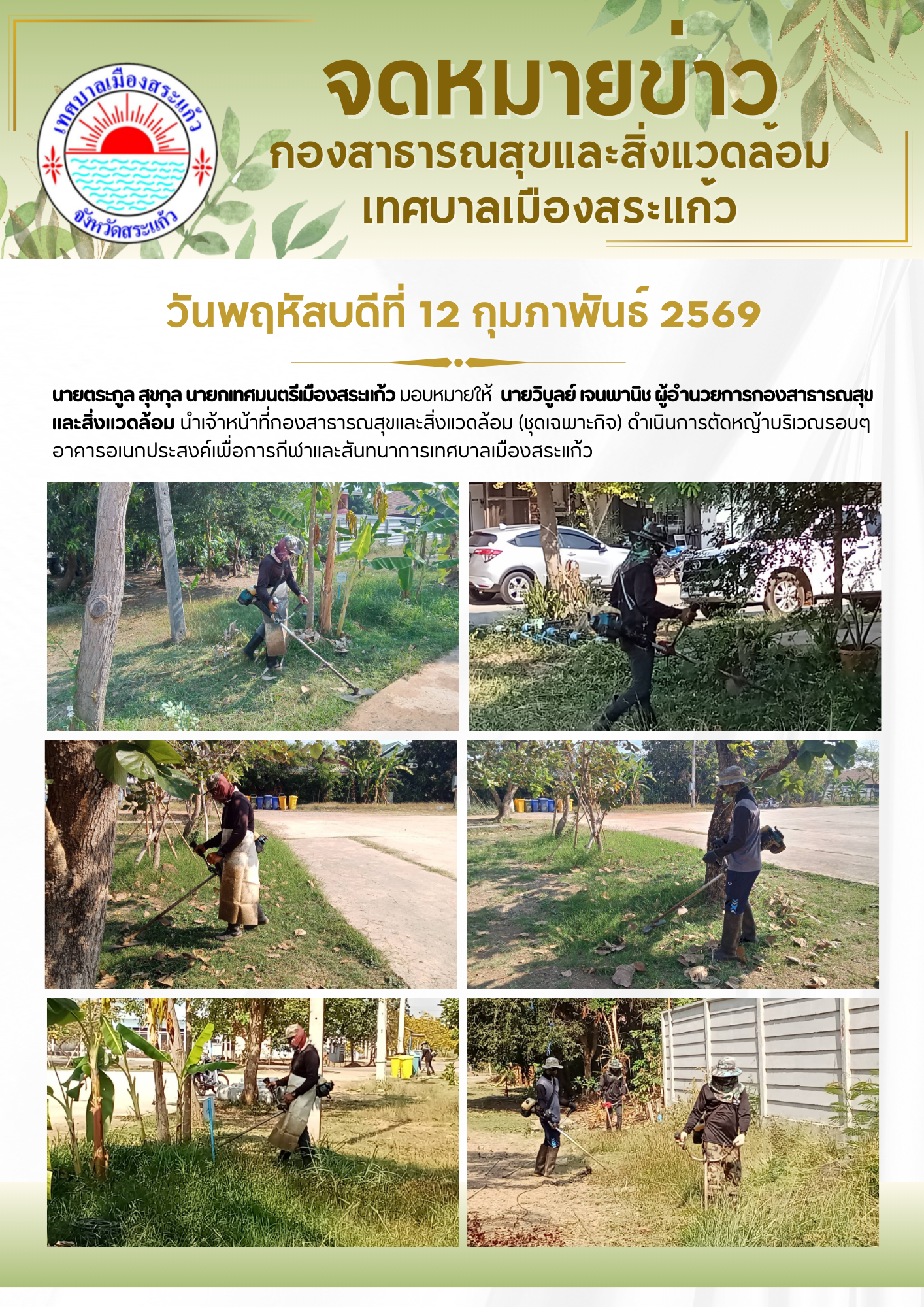 (12 ก.พ. 69) นายตระกูล สุขกุล นายกเทศมนตรีเมืองสระแก้ว มอบหมายให้นายวิบูลย์ เจนพานิช ผู้อำนวยการกองสาธารณสุขและสิ่งแวดล้อม นำเจ้าหน้าที่กองสาธารณสุขและสิ่งแวดล้อม (ชุดเฉพาะกิจ) ดำเนินการตัดหญ้าบริเวณรอบๆ อาคารอเนกประสงค์เพื่อการกีฬาและสันทนาการเทศบาลเมืองสระแก้ว