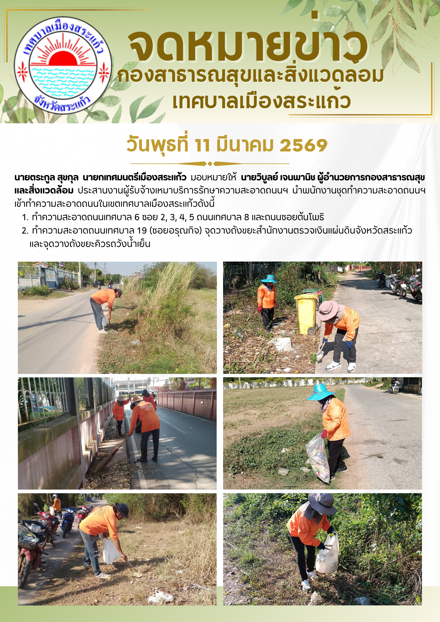 (11 มี.ค. 69) นายตระกูล สุขกุล นายกเทศมนตรีเมืองสระแก้ว มอบหมายให้นายวิบูลย์ เจนพานิช ผู้อำนวยการกองสาธารณสุขและสิ่งแวดล้อม ประสานงานผู้รับจ้างเหมาบริการรักษาความสะอาดถนนฯ นำพนักงานชุดทำความสะอาดถนนฯ เข้าทำความสะอาดถนนในเขตเทศบาลเมืองสระแก้วดังนี้