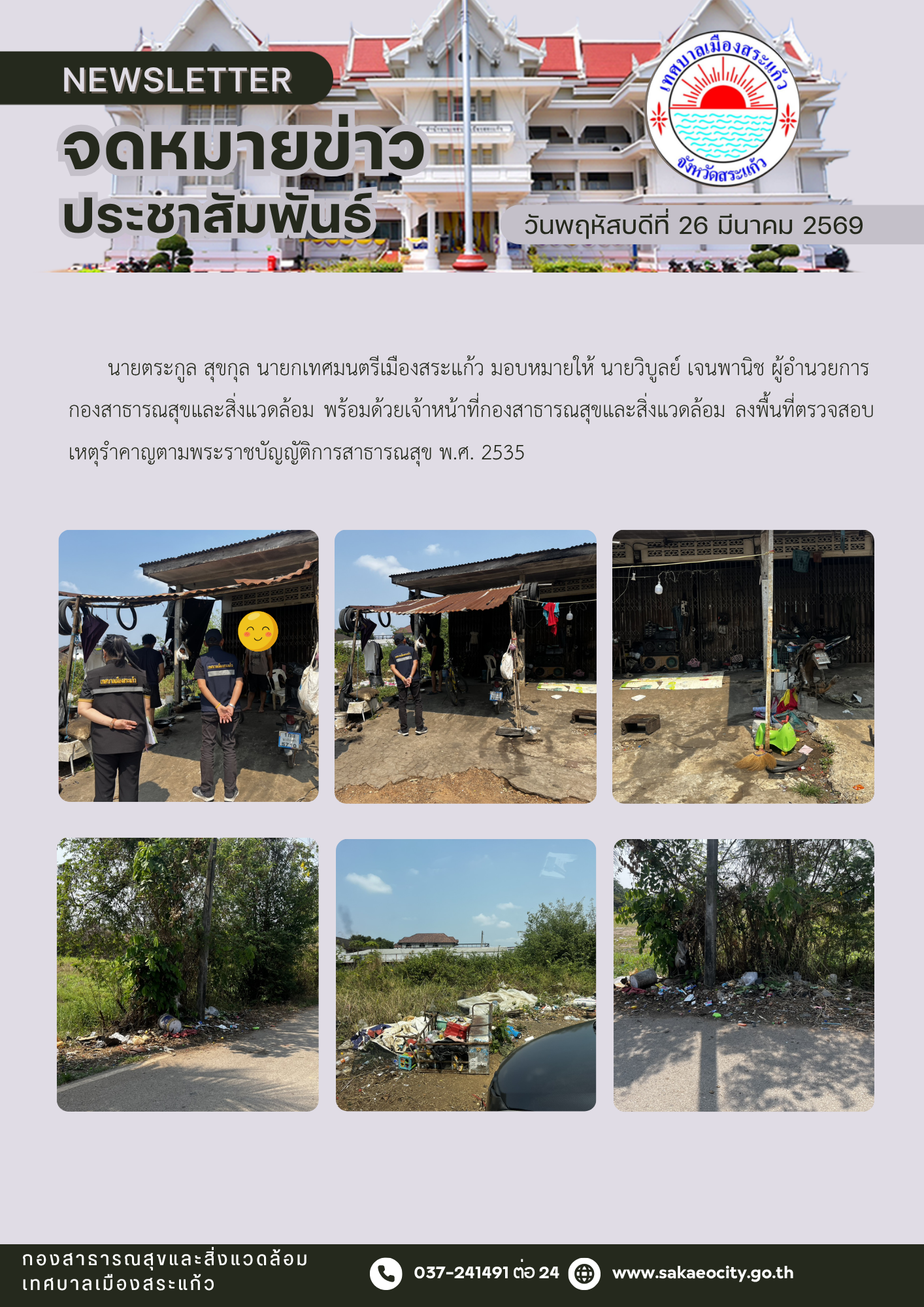(26 มี.ค. 69) นายตระกูล สุขกุล นายกเทศมนตรีเมืองสระแก้ว มอบหมายให้นายวิบูลย์ เจนพานิช ผู้อำนวยการกองสาธารณสุขและสิ่งแวดล้อม พร้อมด้วยเจ้าหน้าที่กองสาธารณสุขและสิ่งแวดล้อม ลงพื้นที่ตรวจสอบเหตุรำคาญตามพระราชบัญญัติการสาธารณสุข พ.ศ. 2535