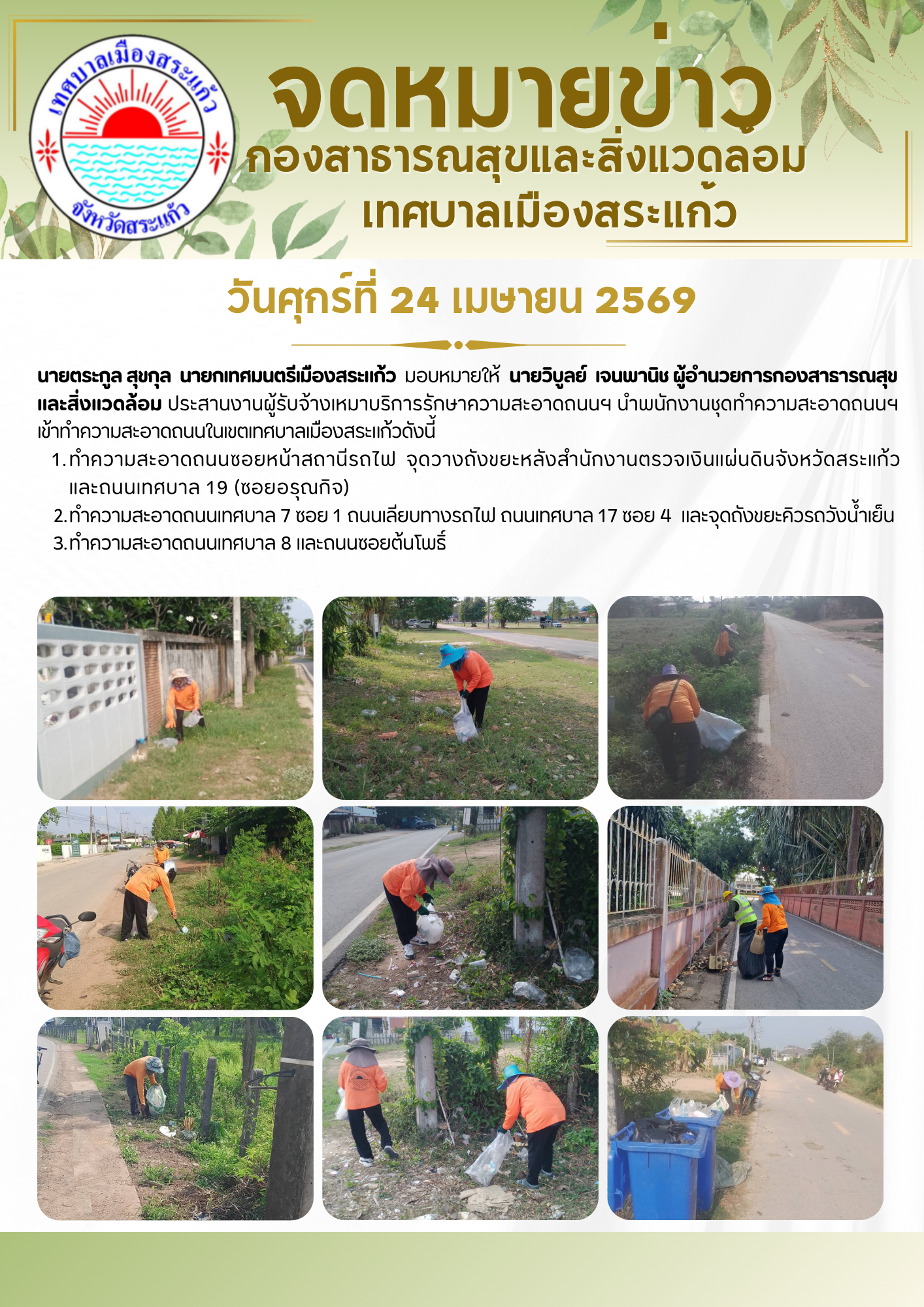 (24 เม.ย. 69) นายตระกูล สุขกุล นายกเทศมนตรีเมืองสระแก้ว มอบหมายให้นายวิบูลย์ เจนพานิช ผู้อำนวยการกองสาธารณสุขและสิ่งแวดล้อม ประสานงานผู้รับจ้างเหมาบริการรักษาความสะอาดถนนฯ นำพนักงานชุดทำความสะอาดถนนฯ เข้าทำความสะอาดถนนในเขตเทศบาลเมืองสระแก้วดังนี้