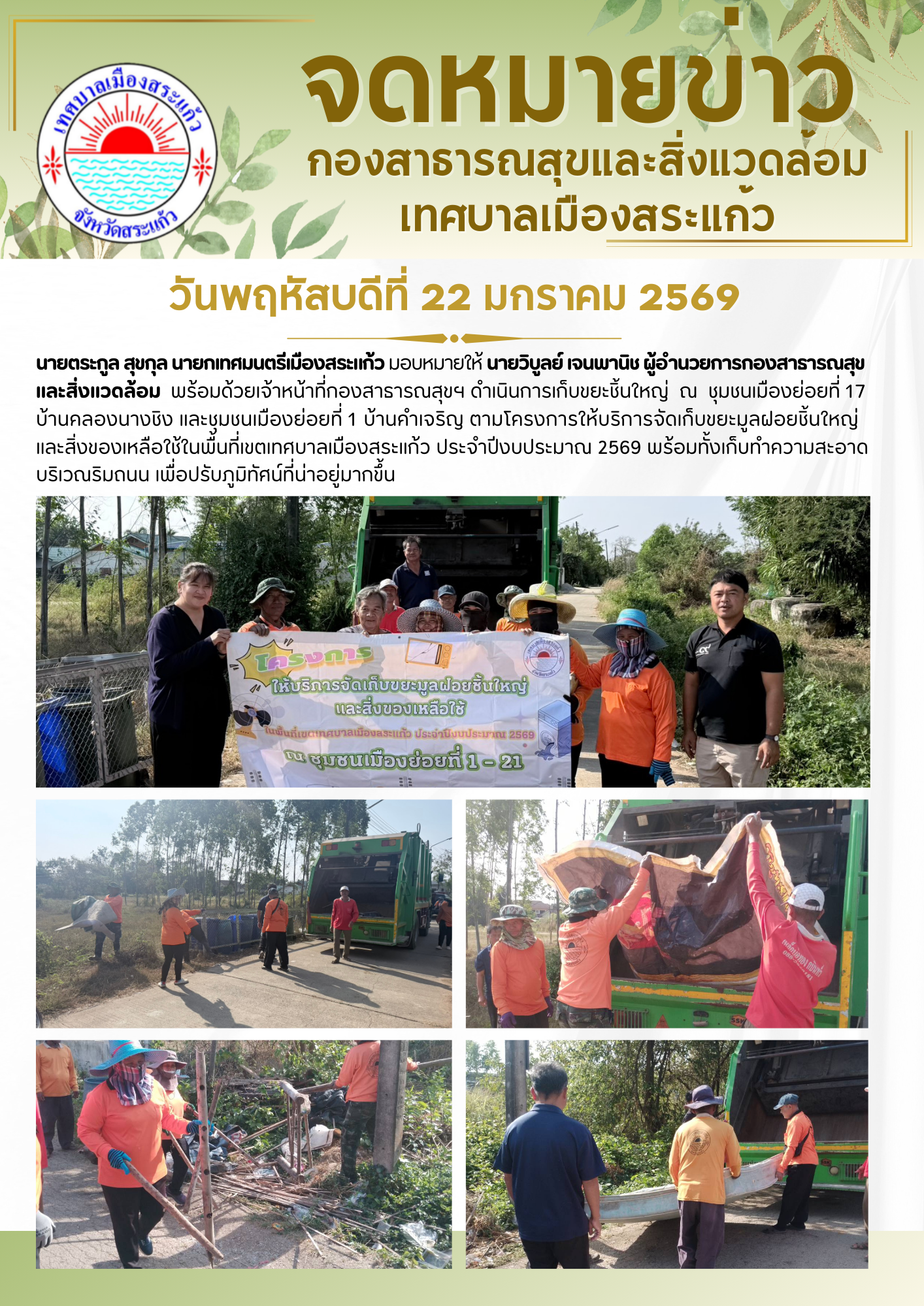 (22 ม.ค. 69) นายตระกูล สุขกุล นายกเทศมนตรีเมืองสระแก้ว มอบหมายให้นายวิบูลย์ เจนพานิช ผู้อำนวยการกองสาธารณสุขและสิ่งแวดล้อม  พร้อมด้วยเจ้าหน้าที่กองสาธารณสุขฯ ดำเนินการเก็บขยะชิ้นใหญ่ ณ ชุมชนเมืองย่อยที่ 17 (บ้านคลองนางชิง) และชุมชนเมืองย่อยที่ 1 (บ้านคำเจริญ) ตามโครงการให้บริการจัดเก็บขยะมูลฝอยชิ้นใหญ่และสิ่งของเหลือใช้ในพื้นที่เขตเทศบาลเมืองสระแก้ว ประจำปีงบประมาณ พ.ศ. 2569 พร้อมทั้งเก็บทำความสะอาดบริเวณริมถนน เพื่อปรับภูมิทัศน์ที่น่าอยู่มากขึ้น