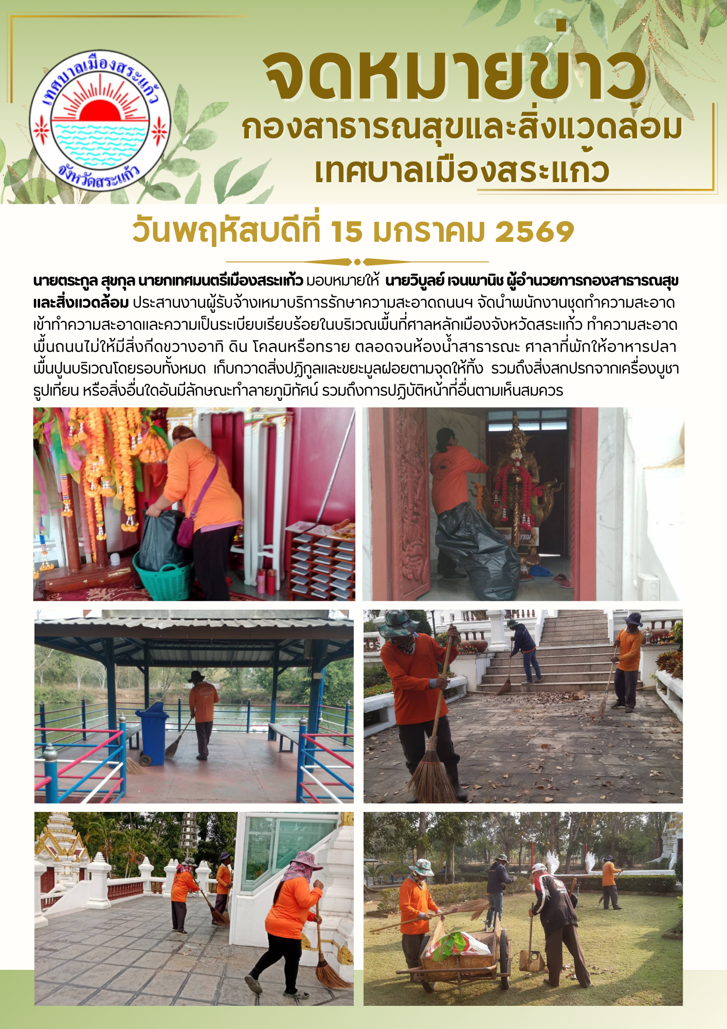(15 ม.ค. 69) นายตระกูล สุขกุล นายกเทศมนตรีเมืองสระแก้ว มอบหมายให้  นายวิบูลย์ เจนพานิช ผู้อำนวยการกองสาธารณสุขและสิ่งแวดล้อม ประสานงานผู้รับจ้างเหมาบริการรักษาความสะอาดถนนฯ จัดนำพนักงานชุดทำความสะอาด เข้าทำความสะอาดและความเป็นระเบียบเรียบร้อยในบริเวณพื้นที่ศาลหลักเมืองจังหวัดสระแก้ว ทำความสะอาดพื้นถนนไม่ให้มีสิ่งกีดขวางอาทิ ดิน โคลนหรือทราย ตลอดจนห้องน้ำสาธารณะ ศาลาที่พักให้อาหารปลา พื้นปูนบริเวณ โดยรอบทั้งหมด  เก็บกวาดสิ่งปฏิกูลและขยะมูลฝอยตามจุดให้ทิ้ง รวมถึงสิ่งสกปรกจากเครื่องบูชาธูปเทียน หรือสิ่งอื่นใดอันมีลักษณะทำลายภูมิทัศน์ รวมถึงการปฏิบัติหน้าที่อื่นตามเห็นสมควร