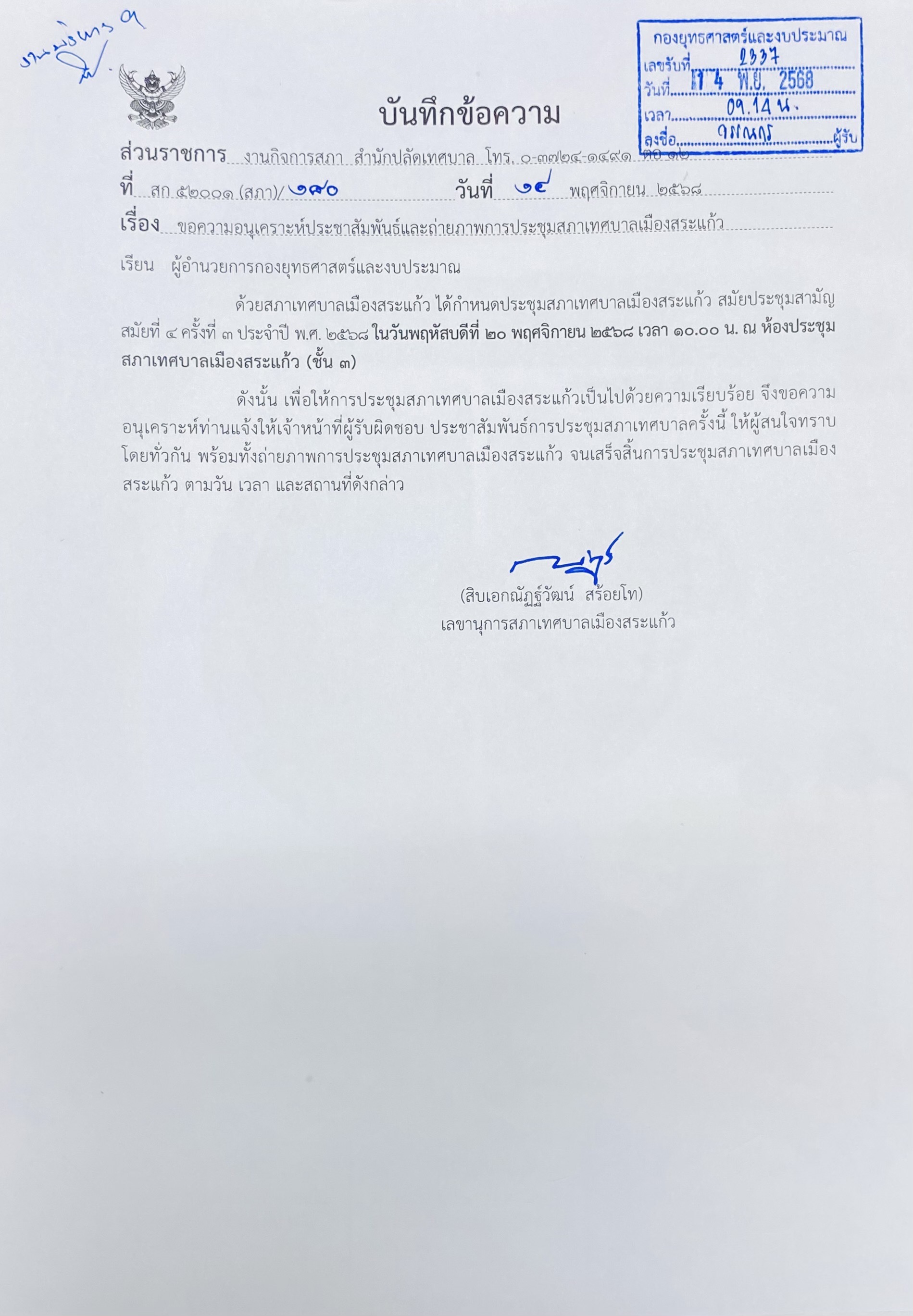 เทศบาลเมืองสระแก้ว กำหนดประชุมสภาเทศบาลเมืองสระแก้ว สมัยประชุมสามัญ สมัยที่ 4 ครั้งที่ 3 ประจำปี พ.ศ. 2568 |