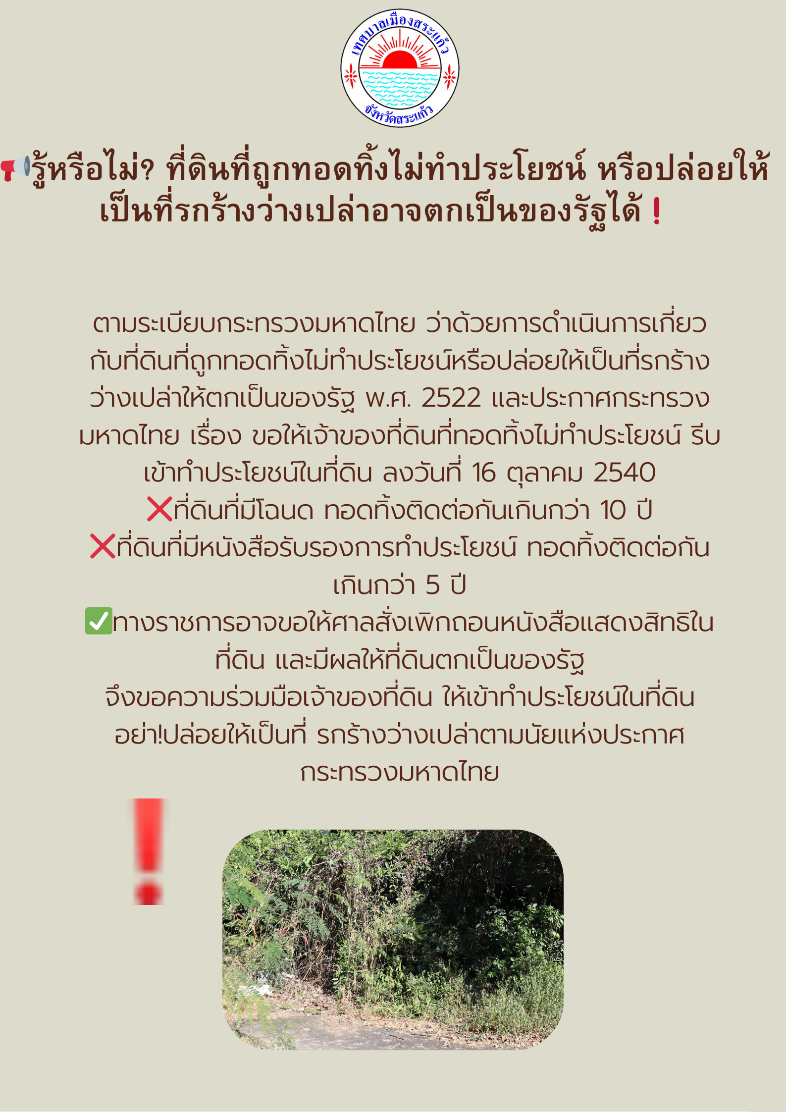 เทศบาลเมืองสระแก้ว ประชาสัมพันธ์ ที่ดินที่ถูกทอดทิ้งไม่ทำประโยชน์ หรือปล่อยให้เป็นที่รกร้างว่างเปล่าอาจตกเป็นของรัฐได้ |