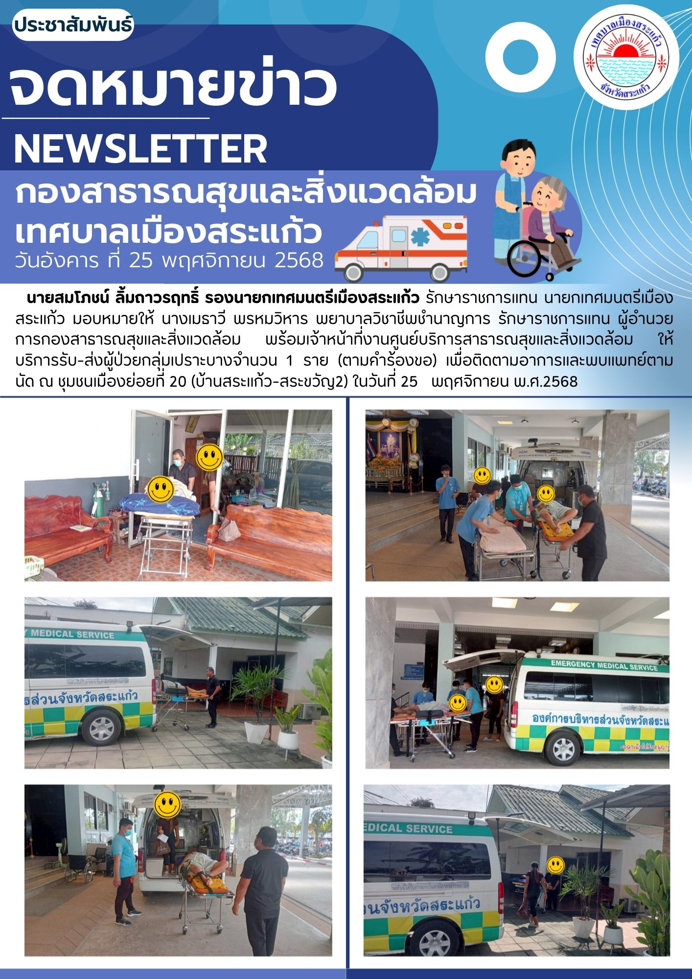 (25 พ.ย. 68) นายสมโภชน์ ลิ้มถาวรฤทธิ์ รองนายกเทศมนตรีเมืองสระแก้ว รักษาราชการแทน นายกเทศมนตรีเมืองสระแก้ว มอบหมายให้นางเมธาวี พรหมวิหาร พยาบาลวิชาชีพชำนาญการ รักษาราชการแทน ผู้อำนวยการกองสาธารณสุขและสิ่งแวดล้อม พร้อมเจ้าหน้าที่งานศูนย์บริการสาธารณสุขและสิ่งแวดล้อม ให้บริการรับ-ส่งผู้ป่วยกลุ่มเปราะบางจำนวน 1 ราย (ตามคำร้องขอ) เพื่อติดตามอาการและพบแพทย์ตามนัด ณ ชุมชนเมืองย่อยที่ 20 (บ้านสระแก้ว-สระขวัญ2)