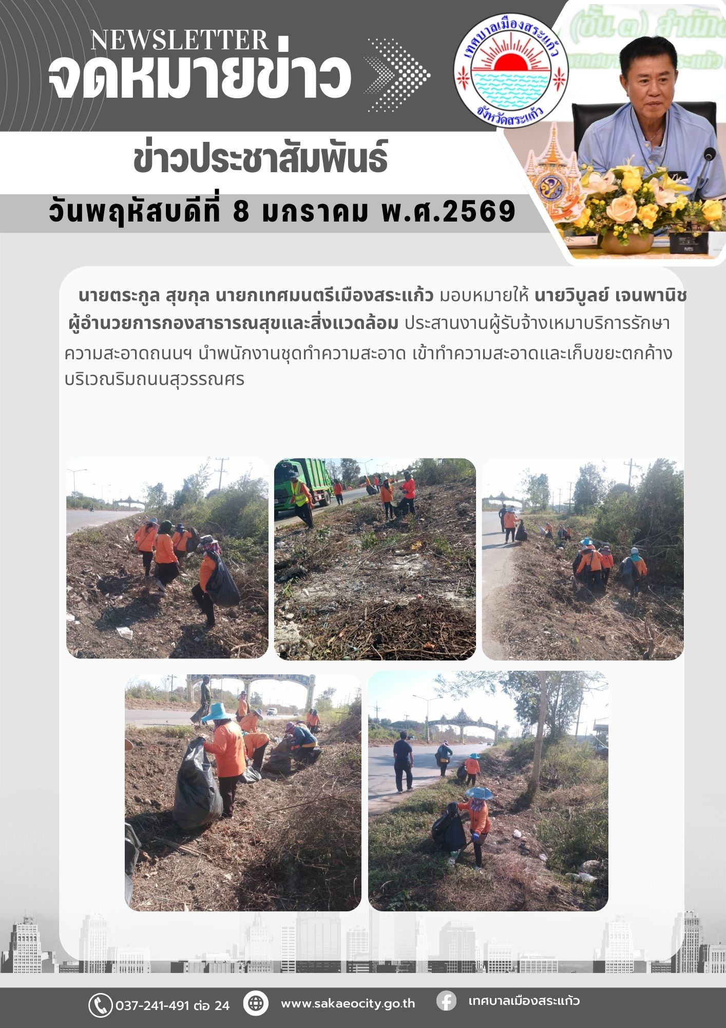 (8 ม.ค. 69)นายตระกูล สุขกุล นายกเทศมนตรีเมืองสระแก้ว มอบหมายให้นายวิบูลย์ เจนพานิช ผู้อำนวยการกองสาธารณสุขและสิ่งแวดล้อม ประสานงานผู้รับจ้างเหมาบริการรักษาความสะอาดถนนฯ นำพนักงานชุดทำความสะอาด เข้าทำความสะอาดและเก็บขยะตกค้าง บริเวณริมถนนสุวรรณศร