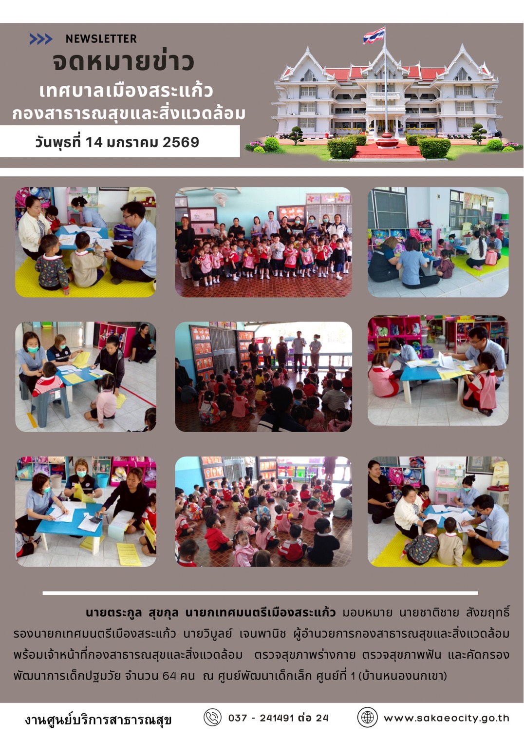 (14 ม.ค. 69) นายตระกูล สุขกุล นายกเทศมนตรีเมืองสระแก้ว มอบหมายนายชาติชาย สังฆฤทธิ์ รองนายกเทศมนตรีเมืองสระแก้ว นายวิบูลย์ เจนพานิช ผู้อำนวยการกองสาธารณสุขและสิ่งแวดล้อม พร้อมเจ้าหน้าที่กองสาธารณสุขและสิ่งแวดล้อม ลงพื้นที่ตรวจสุขภาพร่างกาย ตรวจสุขภาพฟัน และคัดกรองพัฒนาการเด็กปฐมวัย จำนวน 64 คน ณ ศูนย์พัฒนาเด็กเล็ก ศูนย์ที่ 1 (บ้านหนองนกเขา)