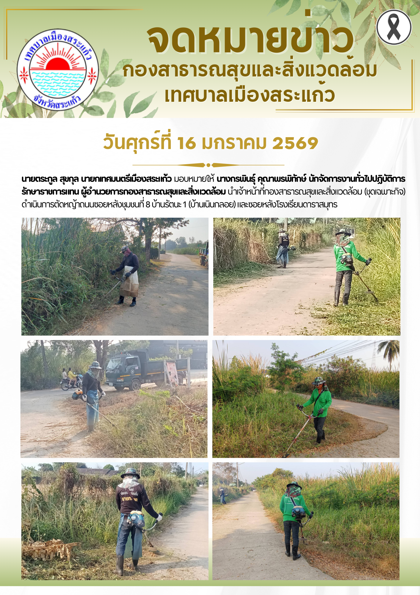 (16 ม.ค. 69) นายตระกูล สุขกุล นายกเทศมนตรีเมืองสระแก้ว มอบหมายให้นางกรพินธุ์ คุณาพรพิทักษ์ นักจัดการงานทั่วไปปฏิบัติการ รักษาราชการแทน ผู้อำนวยการกองสาธารณสุขและสิ่งแวดล้อม นำเจ้าหน้าที่กองสาธารณสุขและสิ่งแวดล้อม (ชุดเฉพาะกิจ) ดำเนินการตัดหญ้าถนนซอยหลังชุมชนที่ 8 บ้านรัตนะ 1 (บ้านเนินกลอย) และซอยหลังโรงเรียนดาราสมุทร