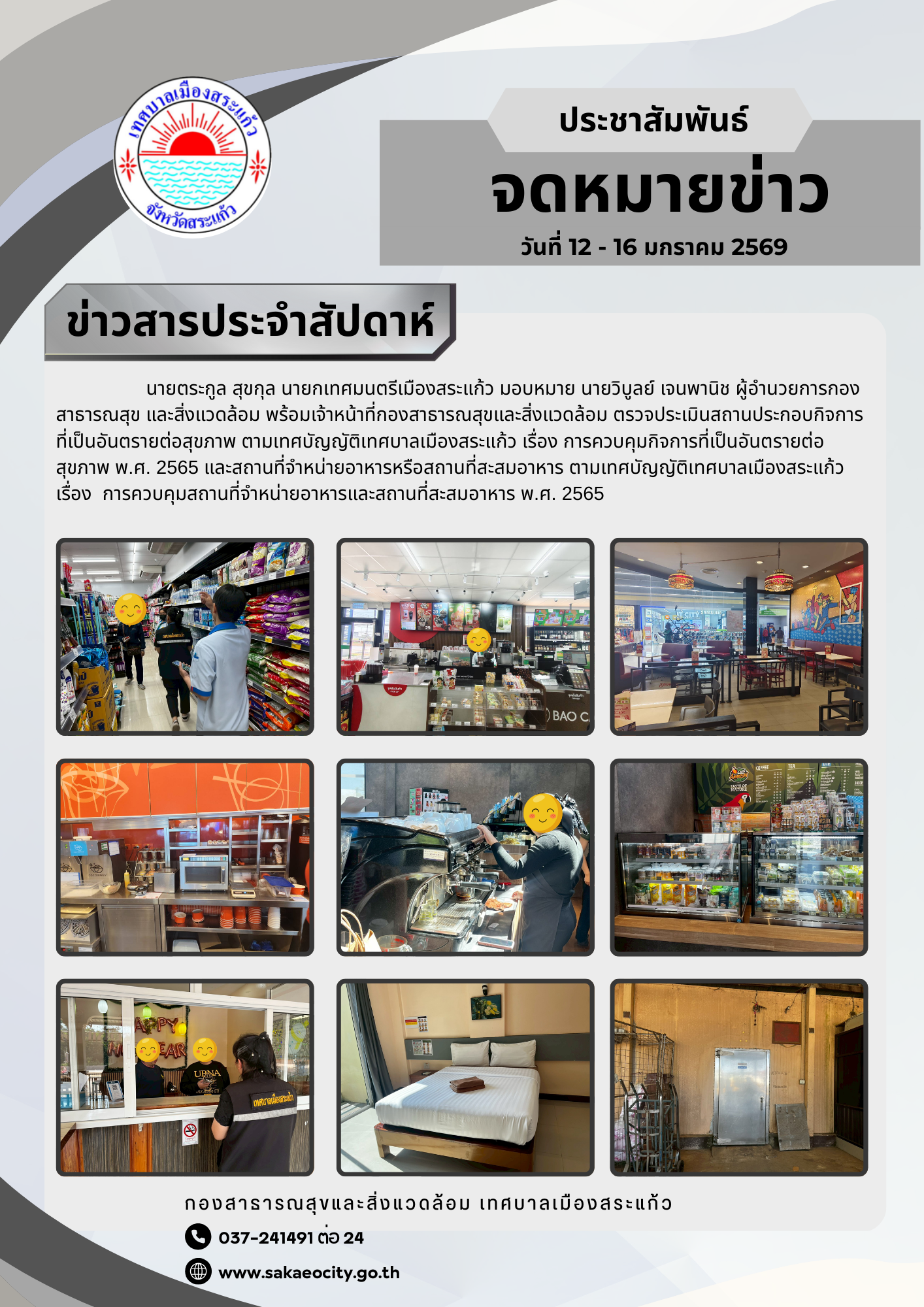 ระหว่างวันที่ 12 -16 มกราคม 2569 นายตระกูล สุขกุล นายกเทศมนตรีเมืองสระแก้ว มอบหมายนายวิบูลย์ เจนพานิช ผู้อำนวยการกองสาธารณสุขและสิ่งแวดล้อม พร้อมเจ้าหน้าที่กองสาธารณสุขและสิ่งแวดล้อม ลงพื้นที่ตรวจประเมินสถานประกอบกิจการที่เป็นอันตรายต่อสุขภาพ ตามเทศบัญญัติเทศบาลเมืองสระแก้ว เรื่อง การควบคุมกิจการที่เป็นอันตรายต่อสุขภาพ พ.ศ. 2565 และสถานที่จำหน่ายอาหารหรือสถานที่สะสมอาหาร ตามเทศบัญญัติเทศบาลเมืองสระแก้ว เรื่อง การควบคุมสถานที่จำหน่ายอาหารและสถานที่สะสมอาหาร พ.ศ. 2565