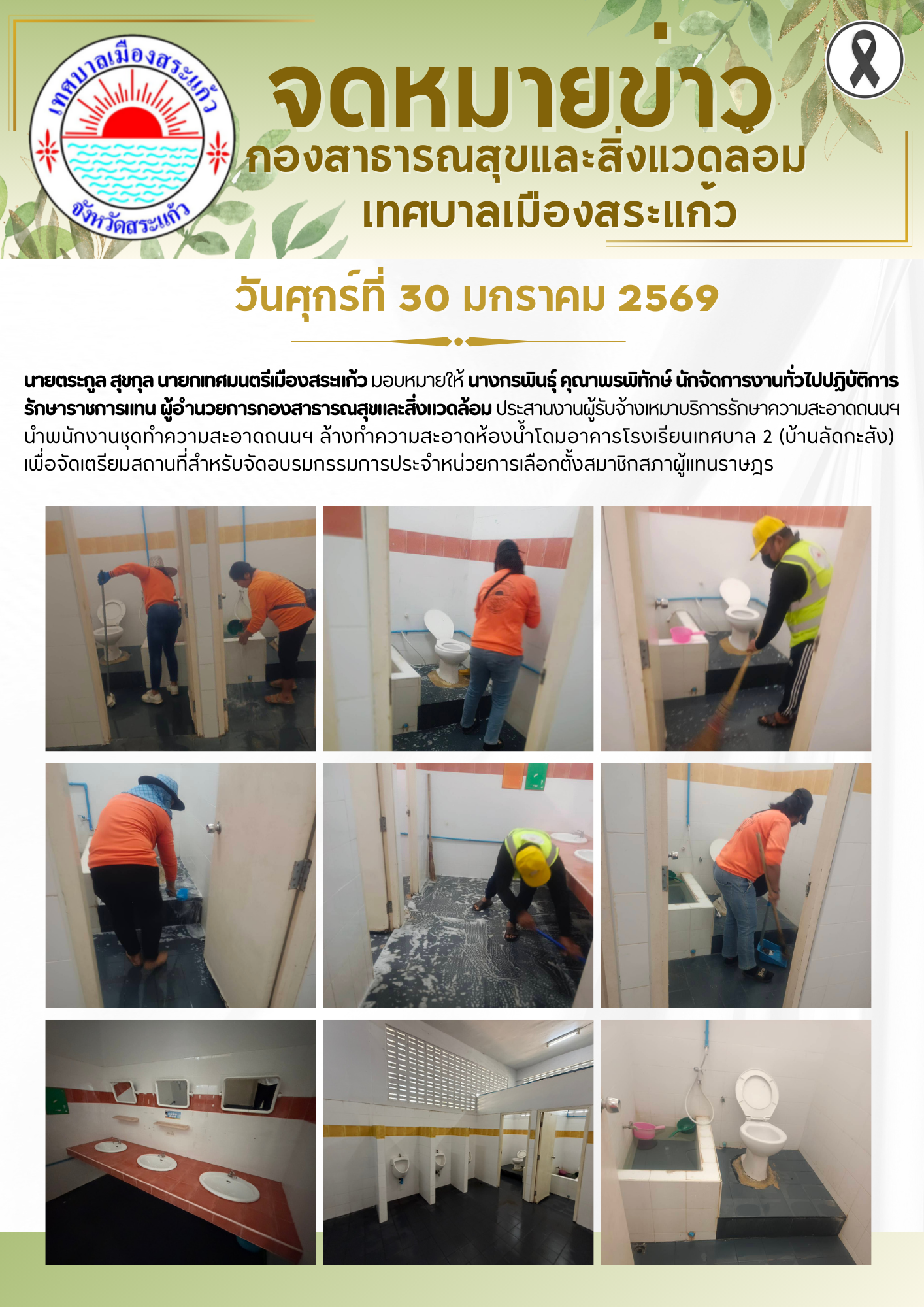 (30 ม.ค. 69) นายตระกูล สุขกุล นายกเทศมนตรีเมืองสระแก้ว มอบหมายให้นางกรพินธุ์ คุณาพรพิทักษ์ นักจัดการงานทั่วไปปฏิบัติการ รักษาราชการแทน ผู้อำนวยการกองสาธารณสุขและสิ่งแวดล้อม ประสานงานผู้รับจ้างเหมาบริการรักษาความสะอาดถนนฯ นำพนักงานชุดทำความสะอาดถนนฯ ล้างทำความสะอาดห้องน้ำโดมอาคารโรงเรียนเทศบาล 2 (บ้านลัดกะสัง) เพื่อจัดเตรียมสถานที่สำหรับจัดอบรมกรรมการประจำหน่วยการเลือกตั้งสมาชิกสภาผู้แทนราษฎร