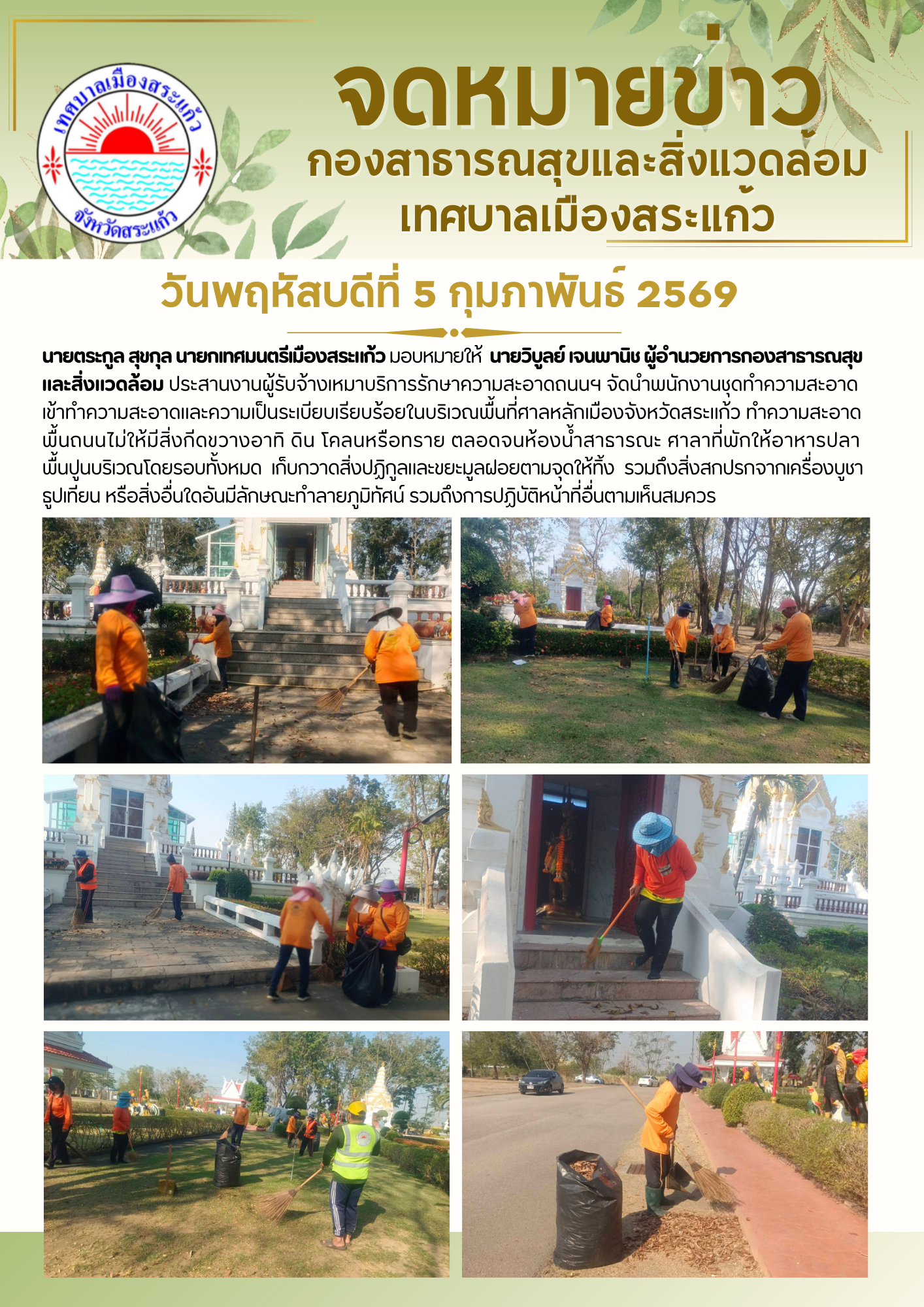 (5 ก.พ. 69) นายตระกูล สุขกุล นายกเทศมนตรีเมืองสระแก้ว มอบหมายให้นายวิบูลย์ เจนพานิช ผู้อำนวยการกองสาธารณสุขและสิ่งแวดล้อม ประสานงานผู้รับจ้างเหมาบริการรักษาความสะอาดถนนฯ จัดนำพนักงานชุดทำความสะอาด เข้าทำความสะอาดและความเป็นระเบียบเรียบร้อยในบริเวณพื้นที่ศาลหลักเมืองจังหวัดสระแก้ว ทำความสะอาดพื้นถนนไม่ให้มีสิ่งกีดขวางอาทิ ดิน โคลนหรือทราย ตลอดจนห้องน้ำสาธารณะ ศาลาที่พักให้อาหารปลา พื้นปูนบริเวณ โดยรอบทั้งหมด เก็บกวาดสิ่งปฏิกูลและขยะมูลฝอยตามจุดให้ทิ้ง รวมถึงสิ่งสกปรกจากเครื่องบูชาธูปเทียน หรือสิ่งอื่นใดอันมีลักษณะทำลายภูมิทัศน์ รวมถึงการปฏิบัติหน้าที่อื่นตามเห็นสมควร