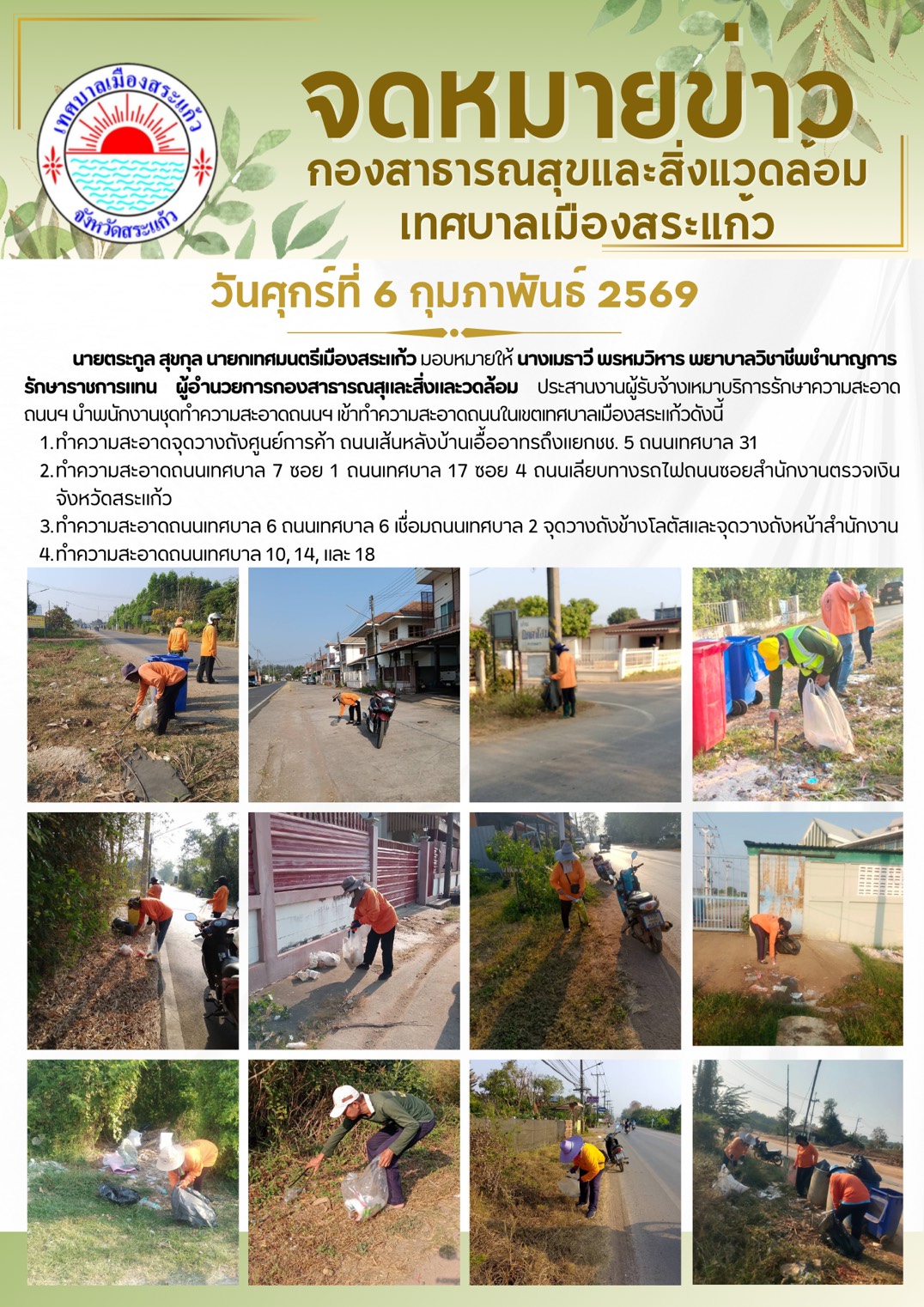 (6 ก.พ. 69) นายตระกูล สุขกุล นายกเทศมนตรีเมืองสระแก้ว มอบหมายให้นางเมธาวี พรหมวิหาร พยาบาลวิชาชีพชำนาญการ รักษาราชการแทน ผู้อำนวยการกองสาธารณสุและสิ่งและวดล้อม ประสานงานผู้รับจ้างเหมาบริการรักษาความสะอาดถนนฯ นำพนักงานชุดทำความสะอาดถนนฯ เข้าทำความสะอาดถนนในเขตเทศบาลเมืองสระแก้วดังนี้