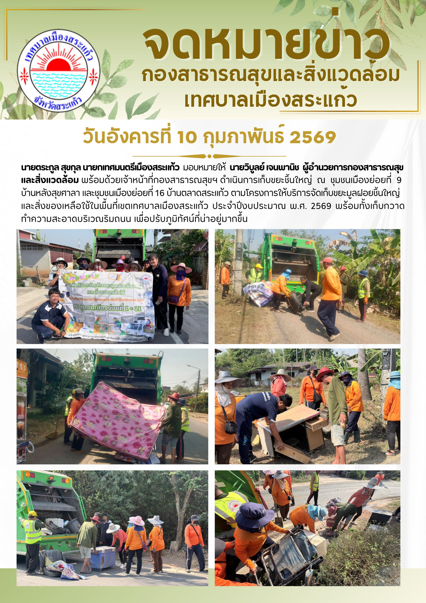 (10 ก.พ. 69) นายตระกูล สุขกุล นายกเทศมนตรีเมืองสระแก้ว มอบหมายให้นายวิบูลย์ เจนพานิช ผู้อำนวยการกองสาธารณสุขและสิ่งแวดล้อม พร้อมด้วยเจ้าหน้าที่กองสาธารณสุขและสิ่งแวดล้อม ดำเนินการเก็บขยะชิ้นใหญ่ ณ ชุมชนเมืองย่อยที่ 9 (บ้านหลังสุขศาลา) และชุมชนเมืองย่อยที่ 16 บ้านตลาดสระแก้ว ตามโครงการให้บริการจัดเก็บขยะมูลฝอยชิ้นใหญ่และสิ่งของเหลือใช้ในพื้นที่เขตเทศบาลเมืองสระแก้ว ประจำปีงบประมาณ พ.ศ. 2569 พร้อมทั้งเก็บกวาดทำความสะอาดบริเวณริมถนน เพื่อปรับภูมิทัศน์ที่น่าอยู่มากขึ้น
