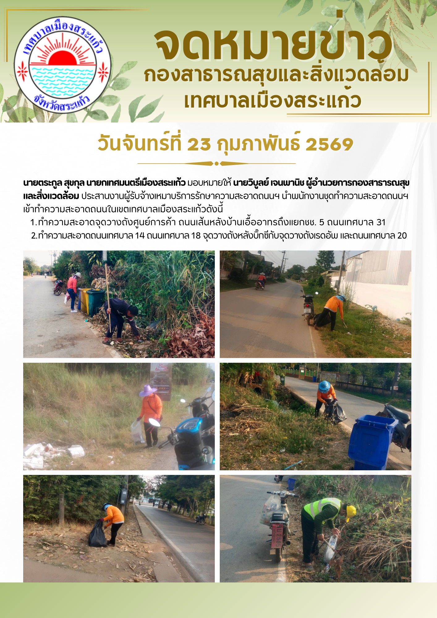 (23 ก.พ. 69) นายตระกูล สุขกุล นายกเทศมนตรีเมืองสระแก้ว มอบหมายให้นายวิบูลย์ เจนพานิช ผู้อำนวยการกองสาธารณสุขและสิ่งแวดล้อม ประสานงานผู้รับจ้างเหมาบริการรักษาความสะอาดถนนฯ นำพนักงานชุดทำความสะอาดถนนฯ เข้าทำความสะอาดถนนในเขตเทศบาลเมืองสระแก้วดังนี้