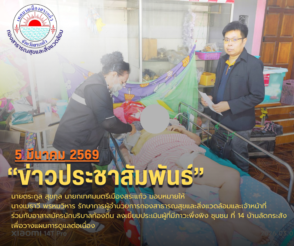 (5 มี.ค 69) นายตระกูล สุขกุล นายกเทศมนตรีเมืองสระแก้ว มอบหมายให้นางเมธาวี พรหมวิหาร รักษาการผู้อำนวยการกองสาธารณสุขและสิ่งแวดล้อม พร้อมเจ้าหน้าที่กองสาธารณสุขและสิ่งแวดล้อม ร่วมกับอาสาสมัครนักบริบาลท้องถิ่น ลงเยี่ยมประเมินผู้ที่มีภาวะพึ่งพิง เพื่อวางแผนการดูแลต่อเนื่อง ณ ชุมชนเมืองย่อยที่ 14 (บ้านลัดกระสัง)