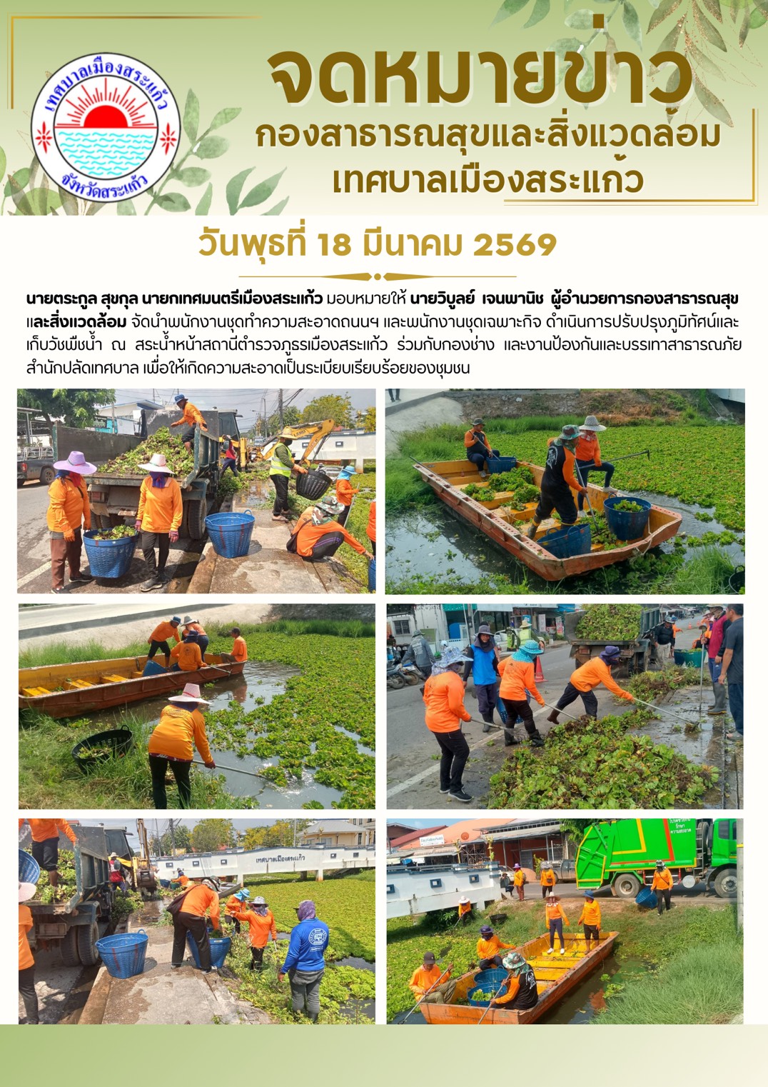 (18 มี.ค. 69) นายตระกูล สุขกุล นายกเทศมนตรีเมืองสระแก้ว มอบหมายให้ นายวิบูลย์ เจนพานิช ผู้อำนวยการกองสาธารณสุขและสิ่งแวดล้อม จัดนำพนักงานชุดทำความสะอาดถนนฯ พนักงานชุดเฉพาะกิจ ร่วมกับกองช่าง และงานป้องกันและบรรเทาสาธารณภัยเทศาลเเมืองสระแก้ว สำนักปลัดเทศบาล ดำเนินการปรับปรุงภูมิทัศน์และเก็บวัชพืชน้ำ ณ สระน้ำหน้าสถานีตำรวจภูธรเมืองสระแก้ว เพื่อให้เกิดความสะอาดเป็นระเบียบเรียบร้อยของชุมชน