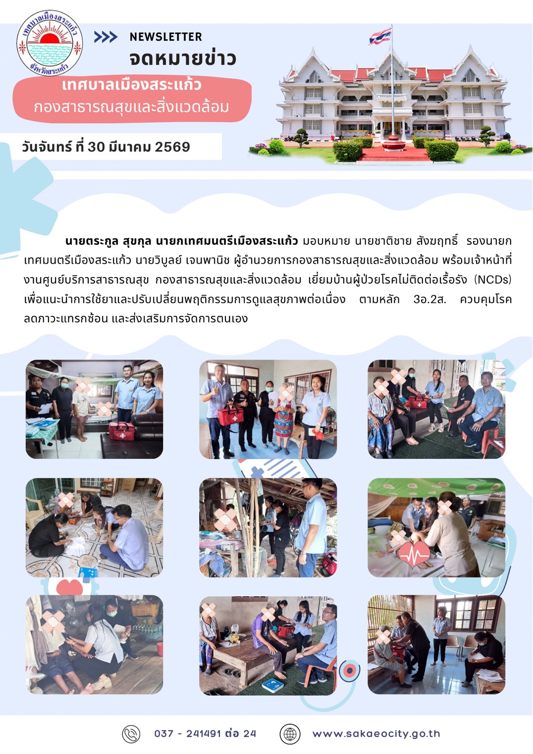 (30 มี.ค. 69) นายตระกูล สุขกุล นายกเทศมนตรีเมืองสระแก้ว มอบหมายนายชาติชาย สังฆฤทธิ์ รองนายกเทศมนตรีเมืองสระแก้ว นายวิบูลย์ เจนพานิช ผู้อำนวยการกองสาธารณสุขและสิ่งแวดล้อม พร้อมเจ้าหน้าที่งานศูนย์บริการสาธารณสุข กองสาธารณสุขและสิ่งแวดล้อม ตรวจเยี่ยมบ้านผู้ป่วยโรคไม่ติดต่อเรื้อรัง (NCDs) เพื่อแนะนำการใช้ยาและปรับเปลี่ยนพฤติกรรมการดูแลสุขภาพต่อเนื่อง ตามหลัก 3อ.2ส. ควบคุมโรคลดภาวะแทรกซ้อน และส่งเสริมการจัดการตนเอง
