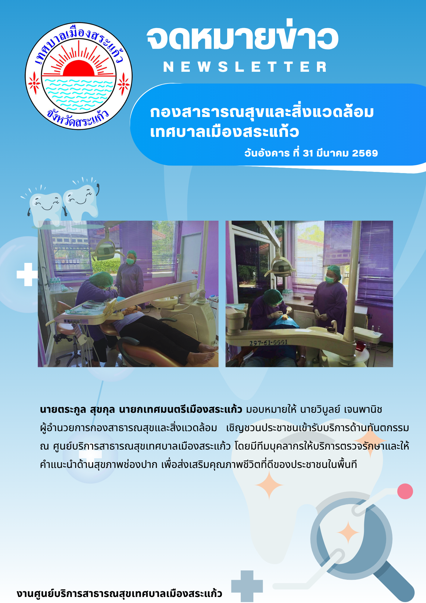 (31 มี.ค. 69) นายตระกูล สุขกุล นายกเทศมนตรีเมืองสระแก้ว มอบหมายให้นายวิบูลย์ เจนพานิช ผู้อำนวยการกองสาธารณสุขและสิ่งแวดล้อม เชิญชวนประชาชนเข้ารับบริการด้านทันตกรรม ณ ศูนย์บริการสาธารณสุขเทศบาลเมืองสระแก้ว โดยมีทีมบุคลากรให้บริการตรวจรักษาและให้คำแนะนำด้านสุขภาพช่องปาก เพื่อส่งเสริมคุณภาพชีวิตที่ดีของประชาชนในพื้นที