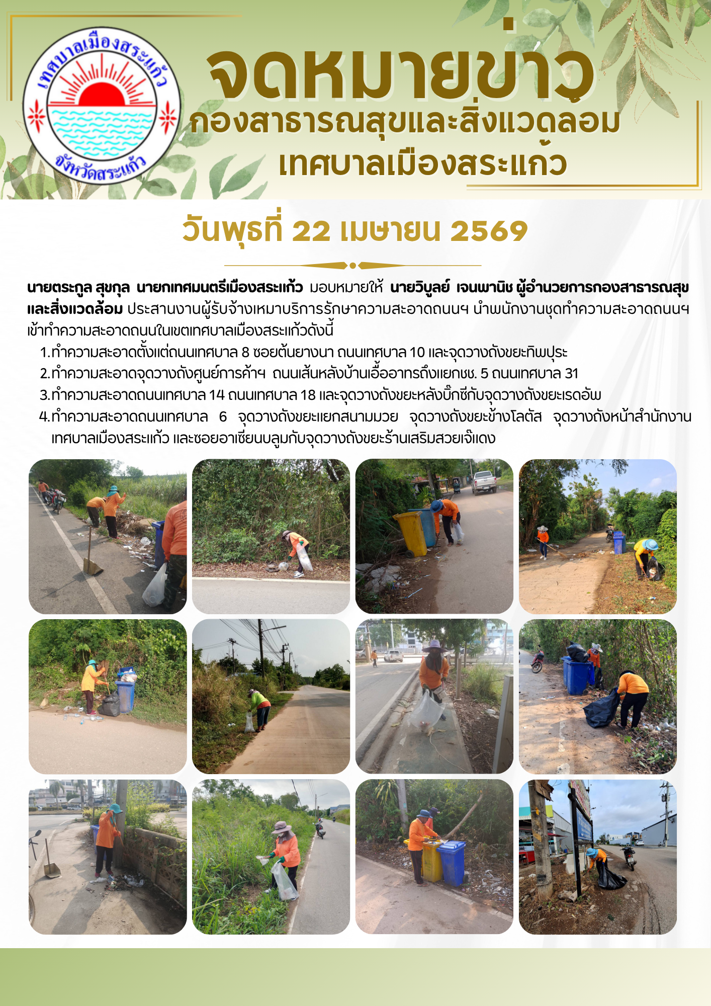 (22 เม.ย. 69) นายตระกูล สุขกุล นายกเทศมนตรีเมืองสระแก้ว มอบหมายให้นายวิบูลย์ เจนพานิช ผู้อำนวยการกองสาธารณสุขและสิ่งแวดล้อม ประสานงานผู้รับจ้างเหมาบริการรักษาความสะอาดถนนฯ นำพนักงานชุดทำความสะอาดถนนฯ เข้าทำความสะอาดถนนในเขตเทศบาลเมืองสระแก้วดังนี้