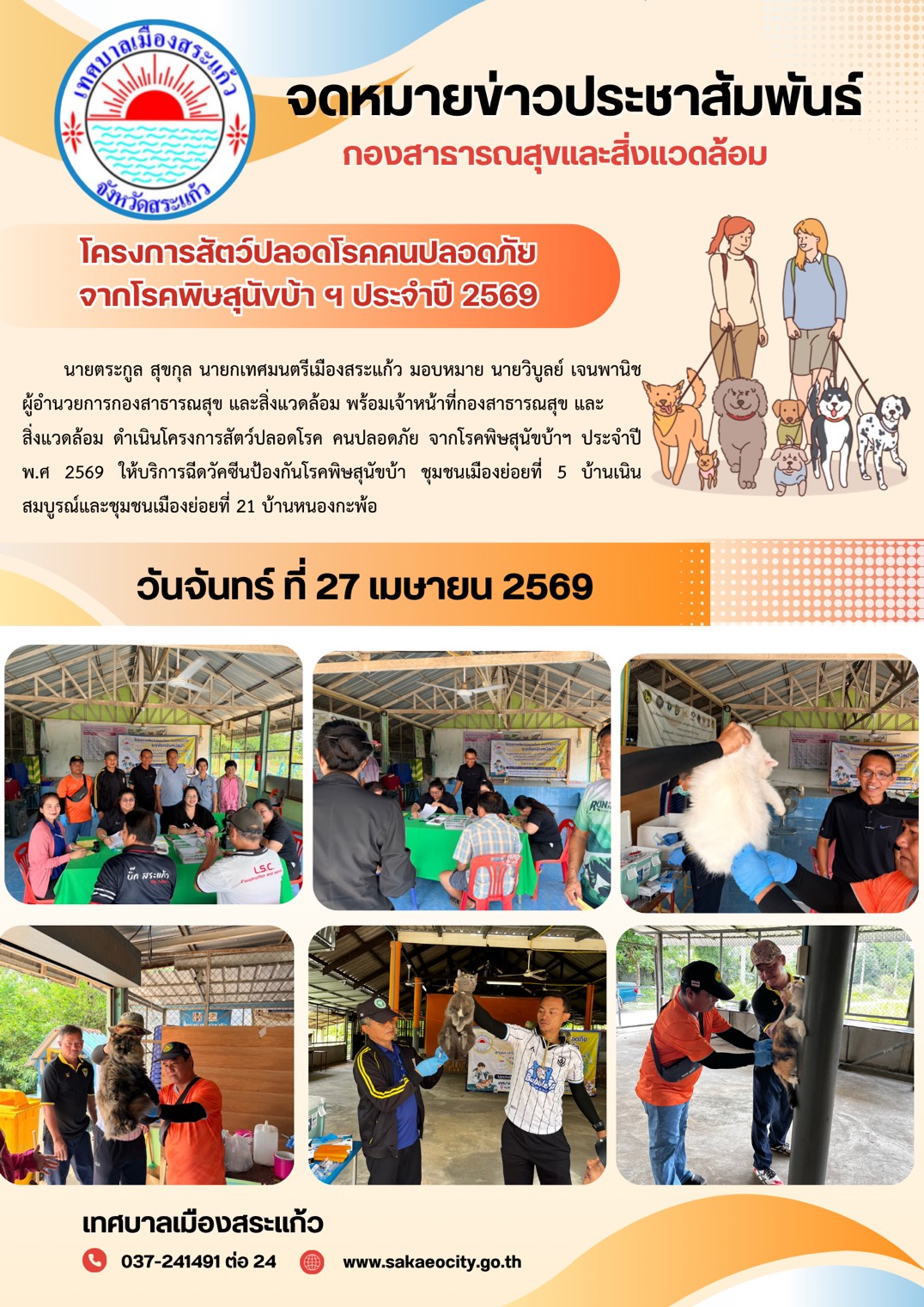 (27 เม.ย. 69) นายตระกูล สุขกุล นายกเทศมนตรีเมืองสระแก้ว มอบหมายนายวิบูลย์ เจนพานิช ผู้อำนวยการกองสาธารณสุข และสิ่งแวดล้อม พร้อมเจ้าหน้าที่กองสาธารณสุขและสิ่งแวดล้อม ดำเนินโครงการสัตว์ปลอดโรค คนปลอดภัย จากโรคพิษสุนัขบ้าฯ ประจำปี พ.ศ 2569 ให้บริการฉีดวัคซีนป้องกันโรคพิษสุนัขบ้า ชุมชนเมืองย่อยที่ 5 (บ้านเนินสมบูรณ์) และชุมชนเมืองย่อยที่ 21 (บ้านหนองกะพ้อ)