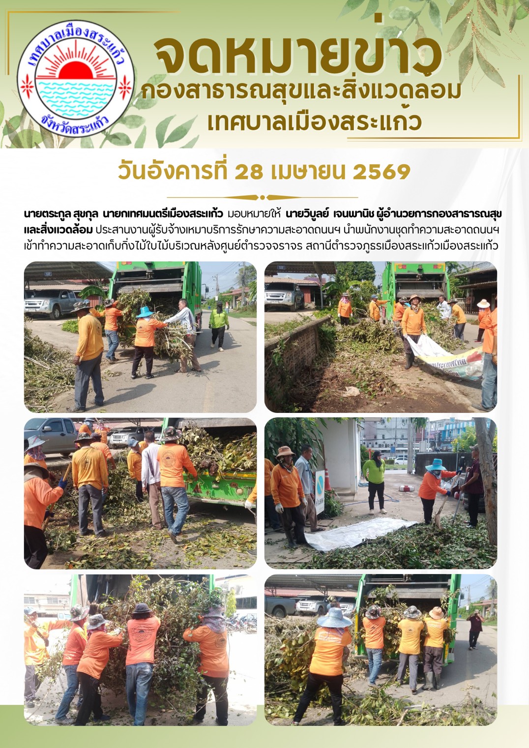 (28 เม.ย. 69) นายตระกูล สุขกุล นายกเทศมนตรีเมืองสระแก้ว มอบหมายให้นายวิบูลย์ เจนพานิช ผู้อำนวยการกองสาธารณสุขและสิ่งแวดล้อม ประสานงานผู้รับจ้างเหมาบริการรักษาความสะอาดถนนฯ นำพนักงานชุดทำความสะอาดถนนฯ เข้าทำความสะอาดเก็บกิ่งไม้ใบไม้ บริเวณหลังศูนย์ตำรวจจราจร สถานีตำรวจภูธรเมืองสระแก้วเมืองสระแก้ว