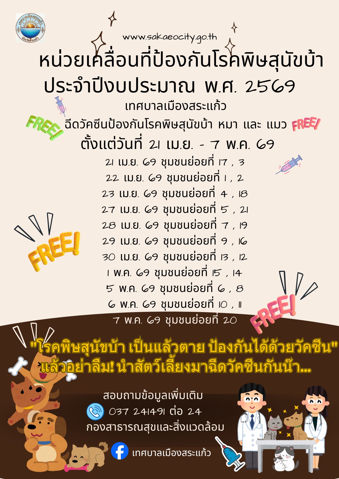 เทศบาลเมืองสระแก้ว ขอประชาสัมพันธ์ หน่วยเคลื่อนที่ป้องกันโรคพิษสุนัขบ้า ประจำปีงบประมาณ พ.ศ. 2569 |