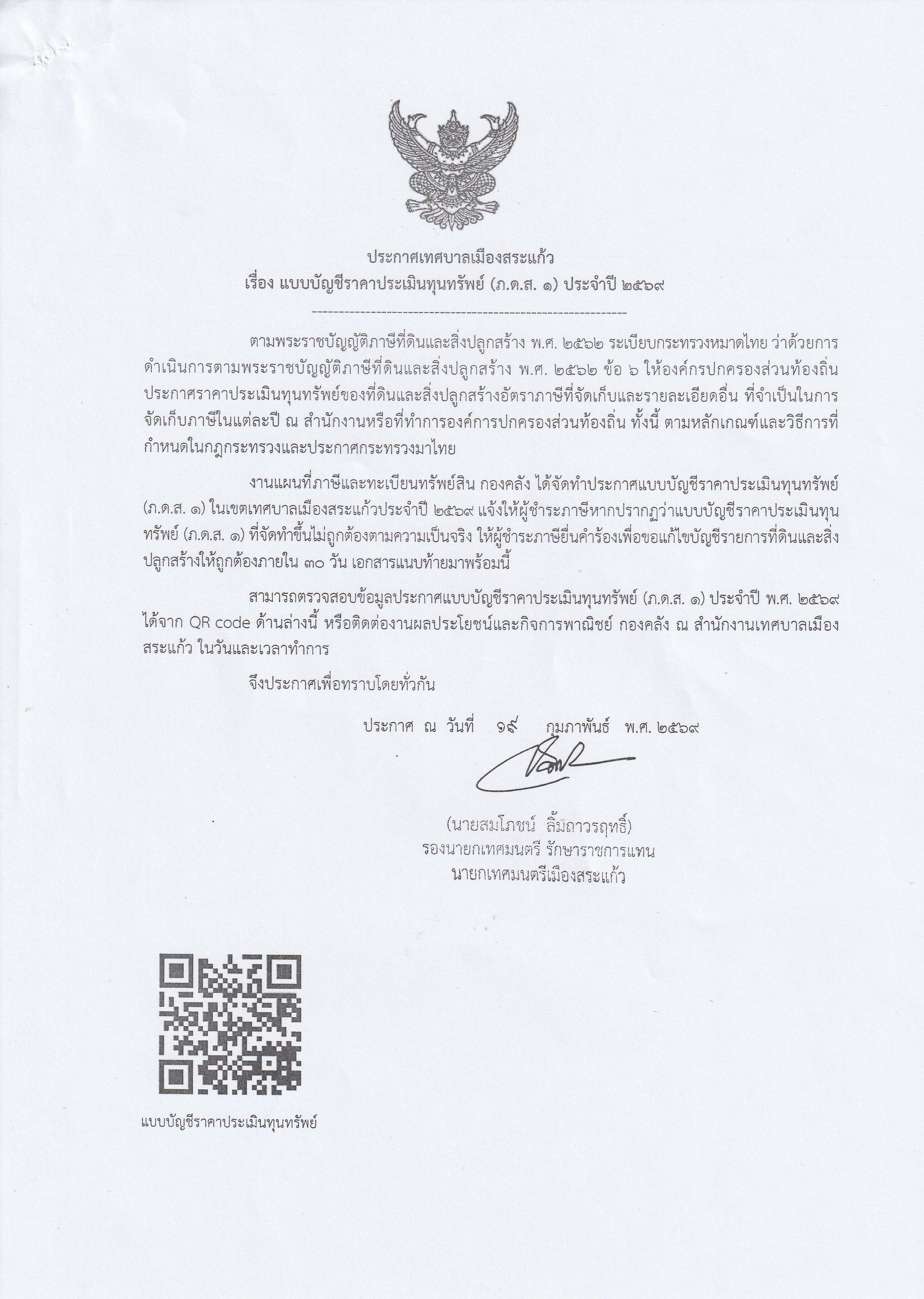 เทศบาลเมืองสระแก้ว ประกาศแบบบัญชีราคาประเมินทุนทรัพย์ (ภ.ด.ส. 1) ประจำปี 2569 |