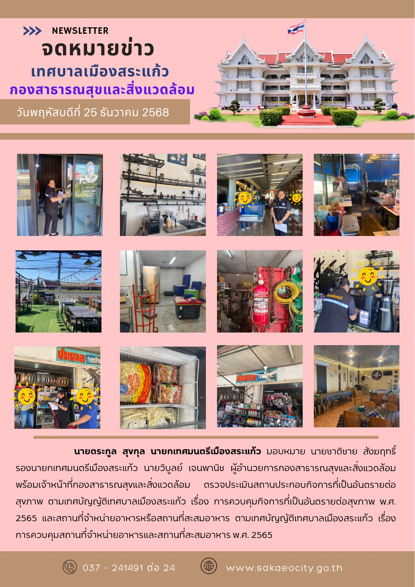 (25 ธ.ค. 68) นายตระกูล สุขกุล นายกเทศมนตรีเมืองสระแก้ว มอบหมายนายชาติชาย สังฆฤทธิ์ รองนายกเทศมนตรีเมืองสระแก้ว นายวิบูลย์ เจนพานิช ผู้อำนวยการกองสาธารณสุขและสิ่งแวดล้อม พร้อมเจ้าหน้าที่กองสาธารณสุขและสิ่งแวดล้อม ตรวจประเมินสถานประกอบกิจการที่เป็นอันตรายต่อสุขภาพ ตามเทศบัญญัติเทศบาลเมืองสระแก้ว เรื่อง การควบคุมกิจการที่เป็นอันตรายต่อสุขภาพ พ.ศ. 2565 และสถานที่จำหน่ายอาหารหรือสถานที่สะสมอาหาร ตามเทศบัญญัติเทศบาลเมืองสระแก้ว เรื่อง การควบคุมสถานที่จำหน่ายอาหารและสถานที่สะสมอาหาร พ.ศ. 2565