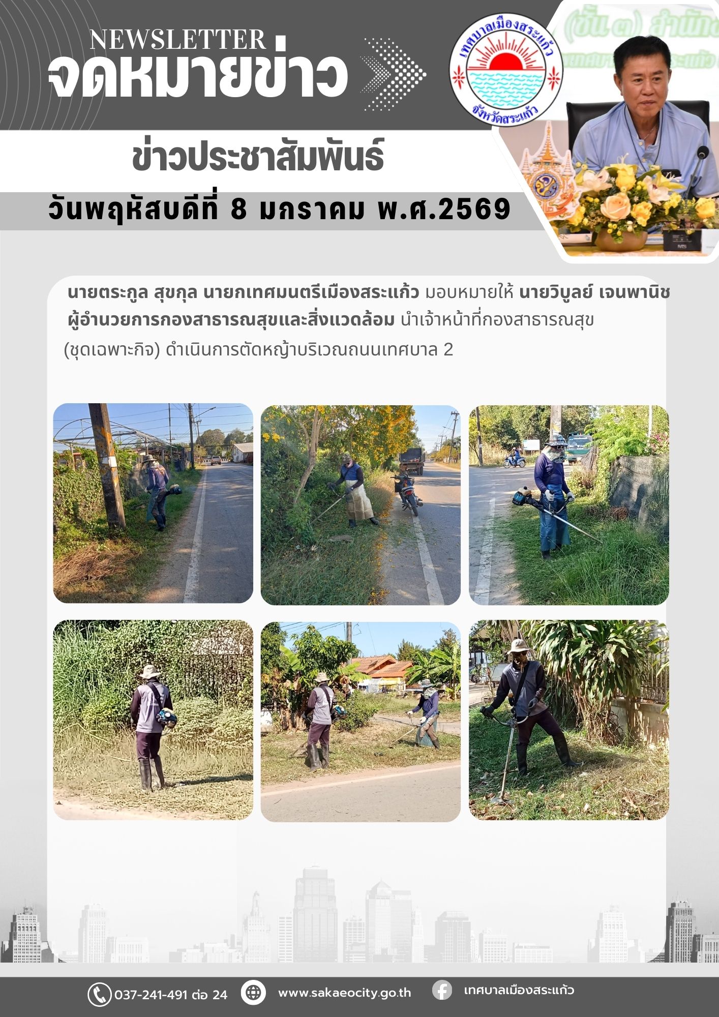 (8 ม.ค. 69)นายตระกูล สุขกุล นายกเทศมนตรีเมืองสระแก้ว มอบหมายให้นายวิบูลย์ เจนพานิช ผู้อำนวยการกองสาธารณสุขและสิ่งแวดล้อม นำเจ้าหน้าที่กองสาธารณสุขและสิ่งแวดล้อม (ชุดเฉพาะกิจ) ดำเนินการตัดหญ้าบริเวรถนนเทศบาล 2