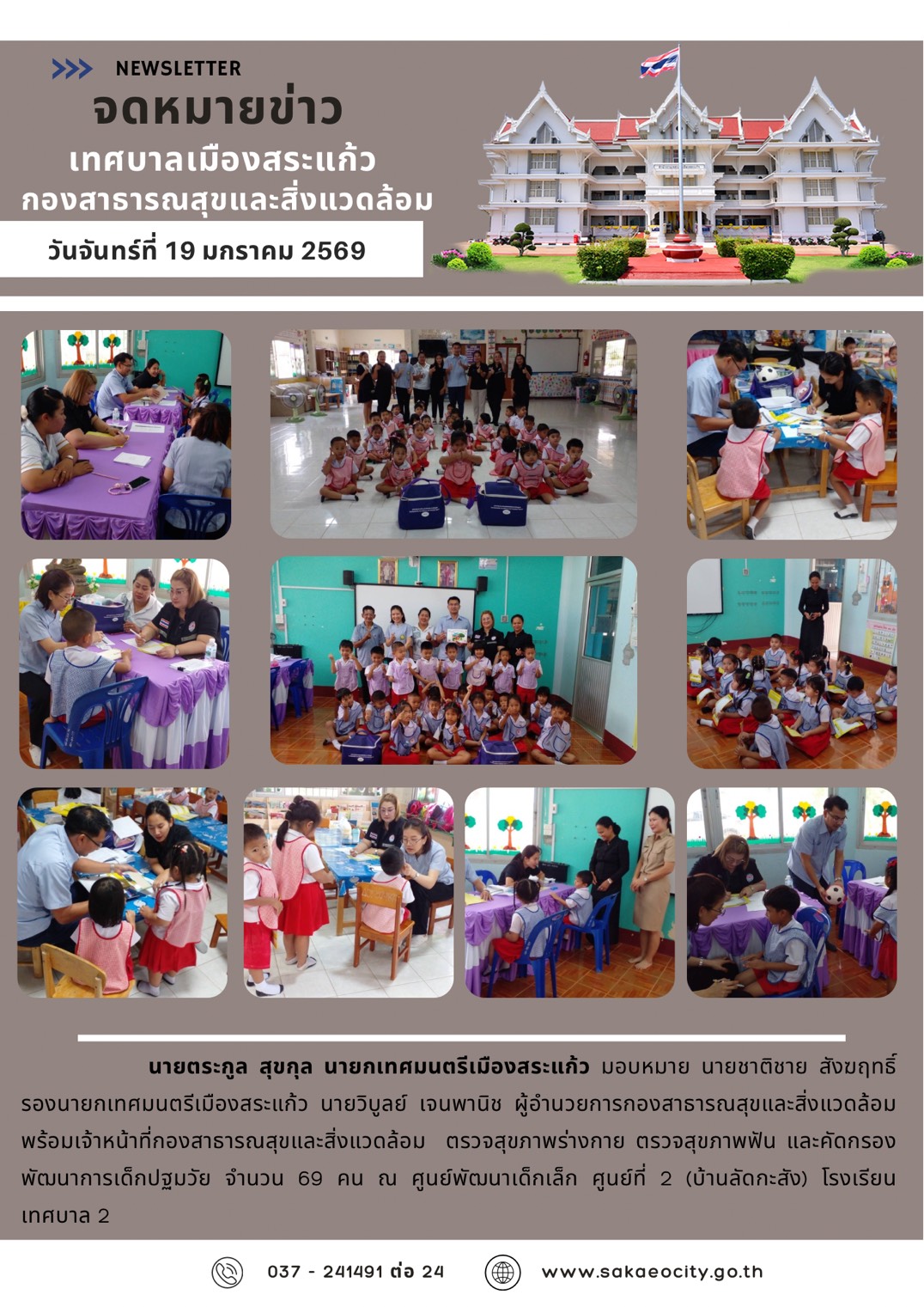 (19 ม.ค. 69) นายตระกูล สุขกุล นายกเทศมนตรีเมืองสระแก้ว มอบหมาย นายชาติชาย สังฆฤทธิ์ รองนายกเทศมนตรีเมืองสระแก้ว นายวิบูลย์ เจนพานิช ผู้อำนวยการกองสาธารณสุขและสิ่งแวดล้อม พร้อมเจ้าหน้าที่กองสาธารณสุขและสิ่งแวดล้อม ลงพื้นที่ตรวจสุขภาพร่างกาย ตรวจสุขภาพฟัน และคัดกรองพัฒนาการเด็กปฐมวัย จำนวน 69 คน ณ ศูนย์พัฒนาเด็กเล็ก ศูนย์ที่ 2 (บ้านลัดกะสัง)