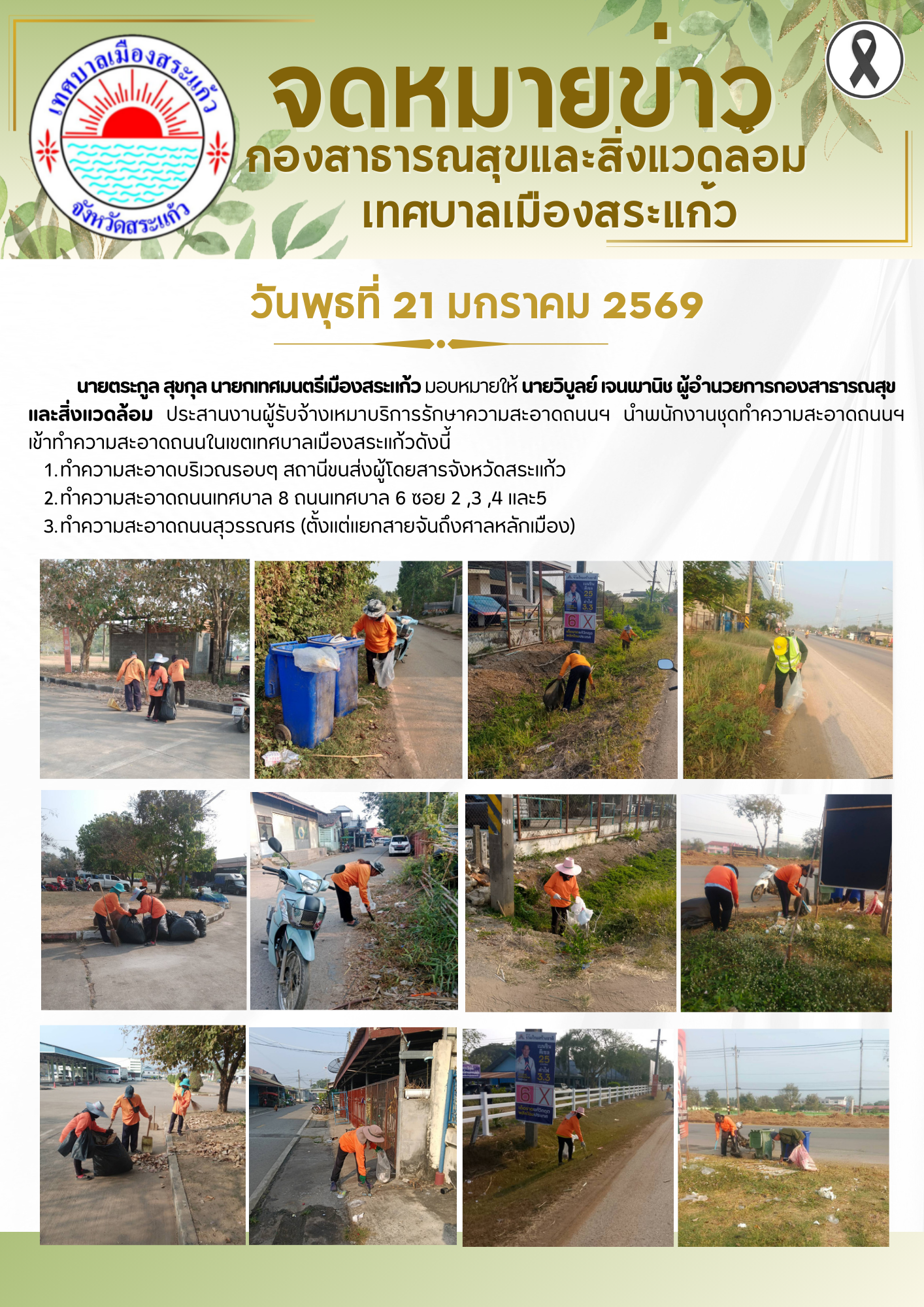 (21 ม.ค. 69) นายตระกูล สุขกุล นายกเทศมนตรีเมืองสระแก้ว มอบหมายให้นายวิบูลย์ เจนพานิช ผู้อำนวยการกองสาธารณสุขและสิ่งแวดล้อม ประสานงานผู้รับจ้างเหมาบริการรักษาความสะอาดถนนฯ นำพนักงานชุดทำความสะอาดถนนฯ เข้าทำความสะอาดถนนในเขตเทศบาลเมืองสระแก้วดังนี้