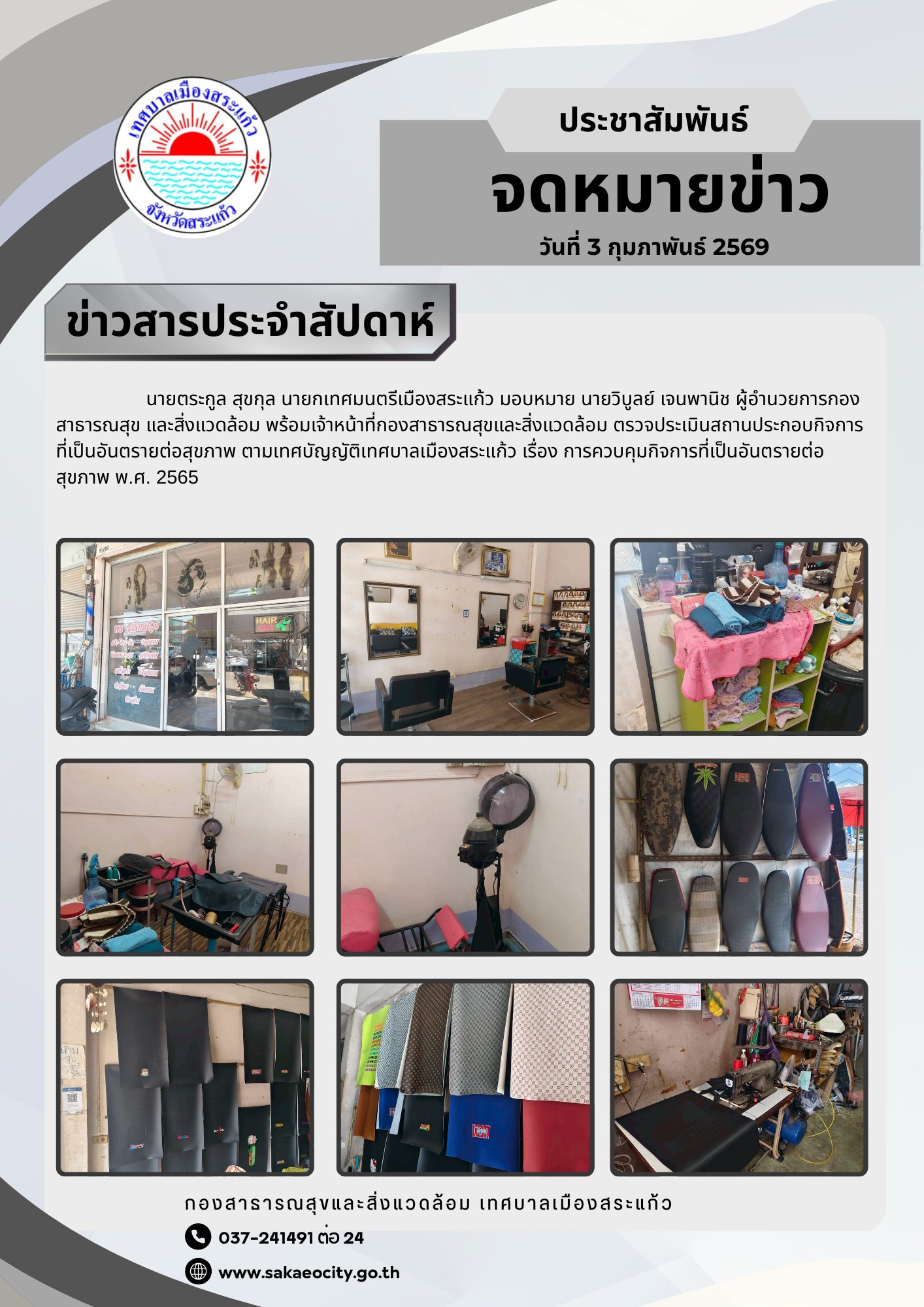 (3 ก.พ. 69) นายตระกูล สุขกุล นายกเทศมนตรีเมืองสระแก้ว มอบหมายนายวิบูลย์ เจนพานิช ผู้อำนวยการกองสาธารณสุขและสิ่งแวดล้อม พร้อมเจ้าหน้าที่กองสาธารณสุขและสิ่งแวดล้อม ลงพื้นที่ตรวจประเมินสถานประกอบกิจการที่เป็นอันตรายต่อสุขภาพ ตามเทศบัญญัติเทศบาลเมืองสระแก้ว เรื่อง การควบคุมกิจการที่เป็นอันตรายต่อสุขภาพ พ.ศ. 2565