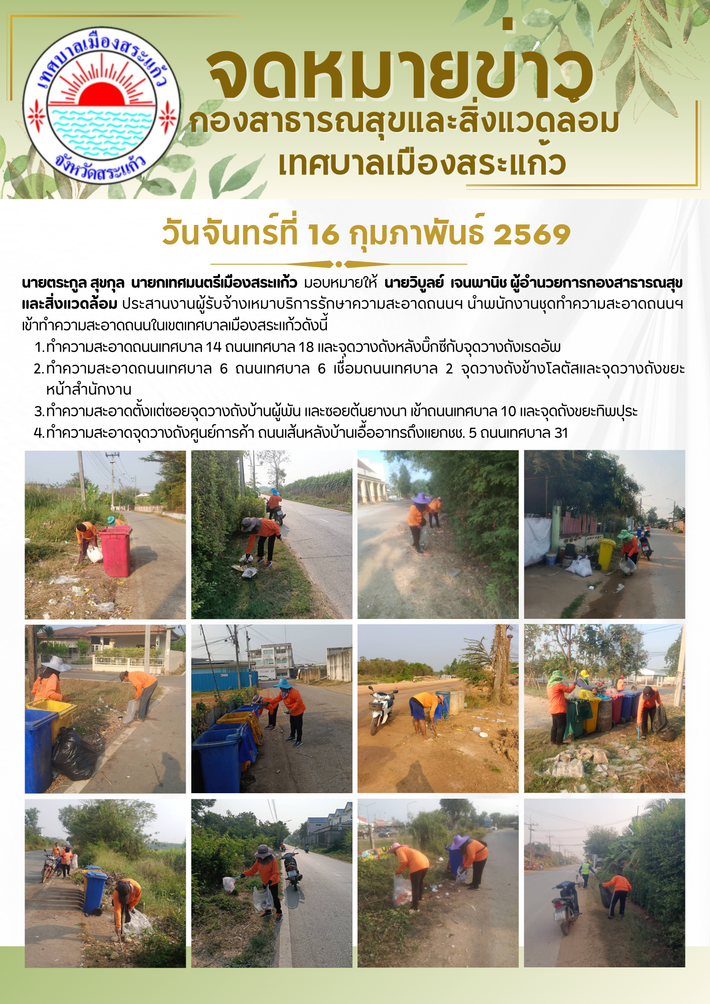 (16 ก.พ. 69) นายตระกูล สุขกุล นายกเทศมนตรีเมืองสระแก้ว มอบหมายให้นายวิบูลย์ เจนพานิช ผู้อำนวยการกองสาธารณสุขและสิ่งแวดล้อม ประสานงานผู้รับจ้างเหมาบริการรักษาความสะอาดถนนฯ นำพนักงานชุดทำความสะอาดถนนฯ เข้าทำความสะอาดถนนในเขตเทศบาลเมืองสระแก้วดังนี้