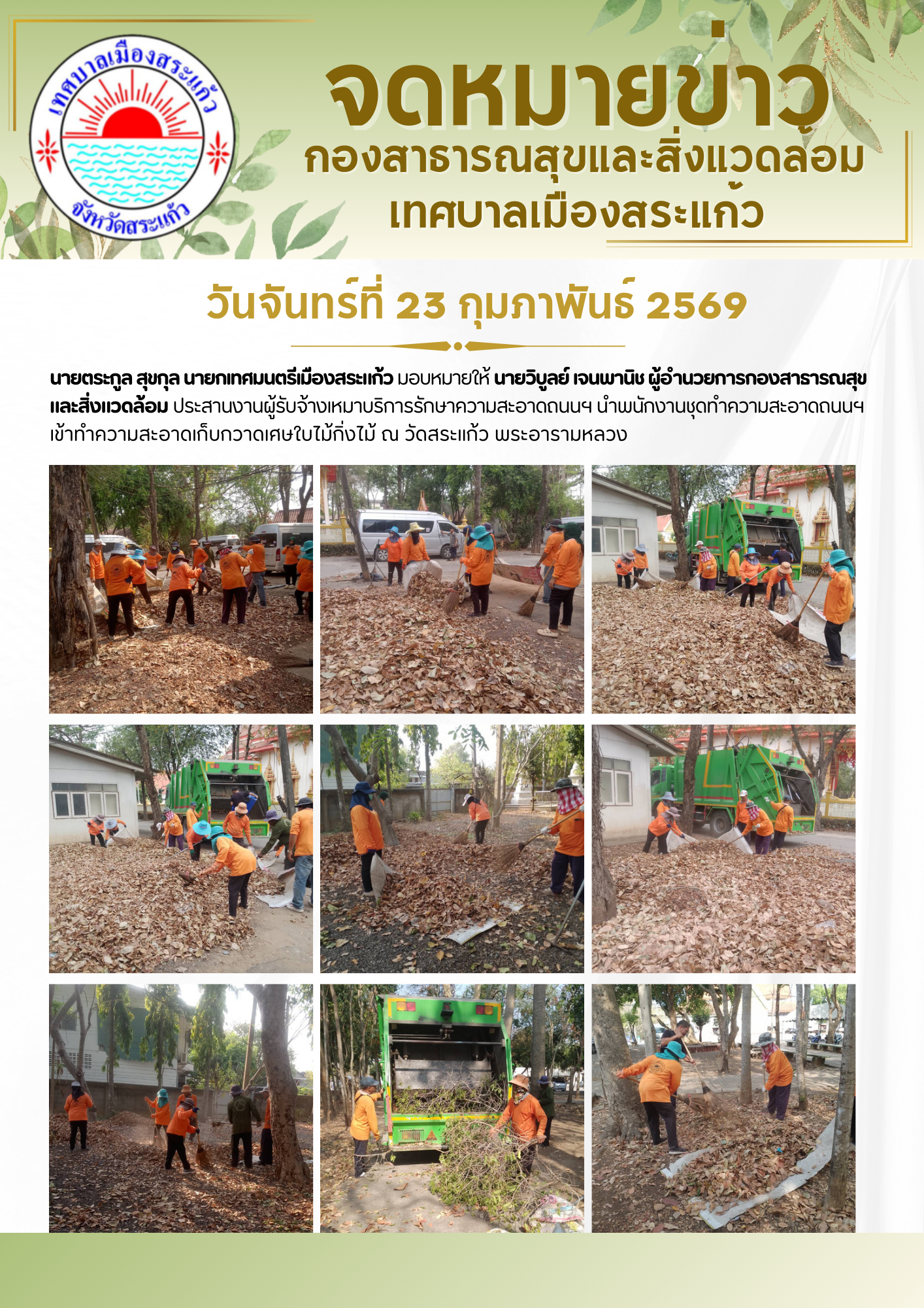 (23 ก.พ. 69) นายตระกูล สุขกุล นายกเทศมนตรีเมืองสระแก้ว มอบหมายให้นายวิบูลย์ เจนพานิช ผู้อำนวยการกองสาธารณสุขและสิ่งแวดล้อม ประสานงานผู้รับจ้างเหมาบริการรักษาความสะอาดถนนฯ นำพนักงานชุดทำความสะอาดถนนฯ เข้าทำความสะอาดเก็บกวาดเศษใบไม้กิ่งไม้ ณ วัดสระแก้ว (พระอารามหลวง)