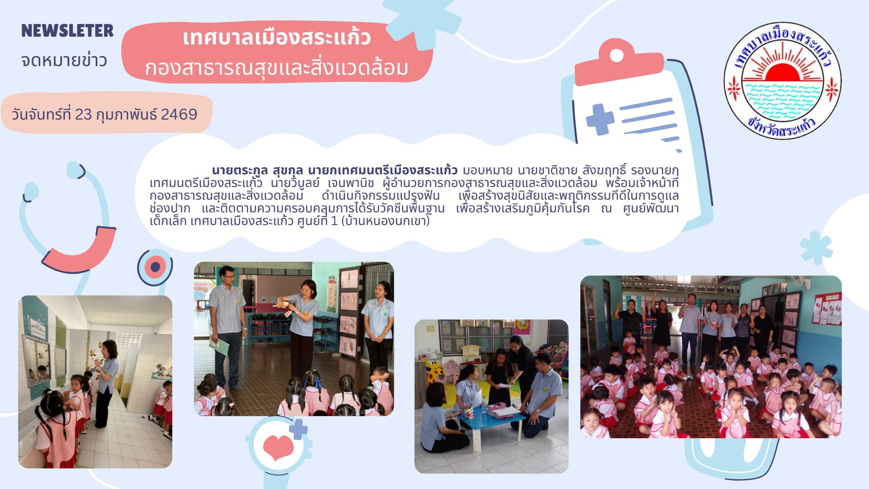 (23 ก.พ. 69) นายตระกูล สุขกุล นายกเทศมนตรีเมืองสระแก้ว มอบหมายนายชาติชาย สังฆฤทธิ์ รองนายกเทศมนตรีเมืองสระแก้ว นายวิบูลย์ เจนพานิช ผู้อำนวยการกองสาธารณสุขและสิ่งแวดล้อม พร้อมเจ้าหน้าที่กองสาธารณสุขและสิ่งแวดล้อม ดำเนินกิจกรรมแปรงฟัน เพื่อสร้างสุขนิสัยและพฤติกรรมทีดีในการดูแลช่องปาก และติดตามความครอบคลุมการได้รับวัคซีนพื้นฐาน เพื่อสร้างเสริมภูมิคุ้มกันโรค ณ ศูนย์พัฒนาเด็กเล็ก เทศบาลเมืองสระแก้ว ศูนย์ที่ 1 (บ้านหนองนกเขา)