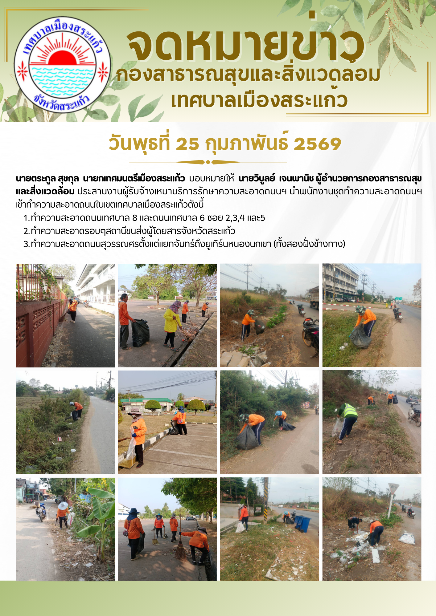 (25 ก.พ. 69) นายตระกูล สุขกุล นายกเทศมนตรีเมืองสระแก้ว มอบหมายให้นายวิบูลย์ เจนพานิช ผู้อำนวยการกองสาธารณสุขและสิ่งแวดล้อม ประสานงานผู้รับจ้างเหมาบริการรักษาความสะอาดถนนฯ นำพนักงานชุดทำความสะอาดถนนฯ เข้าทำความสะอาดถนนในเขตเทศบาลเมืองสระแก้วดังนี้