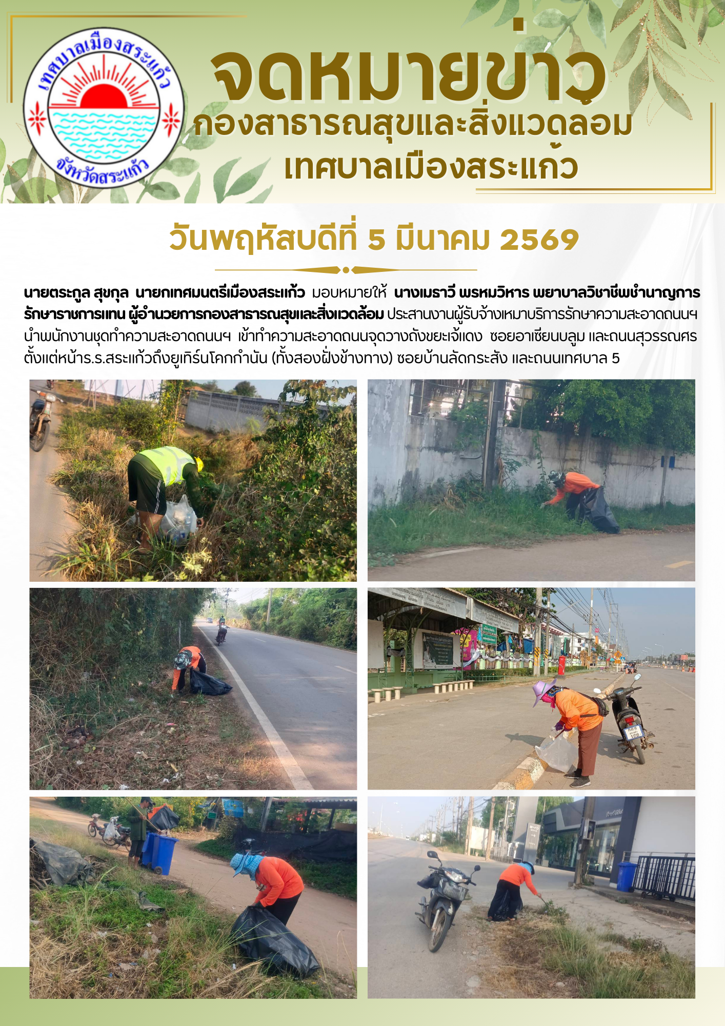 (5 มี.ค. 69) นายตระกูล สุขกุล นายกเทศมนตรีเมืองสระแก้ว มอบหมายให้นางเมธาวี พรหมวิหาร พยาบาลวิชาชีพชำนาญการ รักษาราชการแทน ผู้อำนวยการกองสาธารณสุขและสิ่งแวดล้อม ประสานงานผู้รับจ้างเหมาบริการรักษาความสะอาดถนนฯ นำพนักงานชุดทำความสะอาดถนนฯ เข้าทำความสะอาดถนนจุดวางถังขยะเจ้แดง , ซอยอาเซียนบลูม และถนนสุวรรณศรตั้งแต่หน้าร.ร.สระแก้วถึงยูเทิร์นโคกกำนัน (ทั้งสองฝั่งข้างทาง) , ซอยบ้านลัดกระสัง และถนนเทศบาล 5