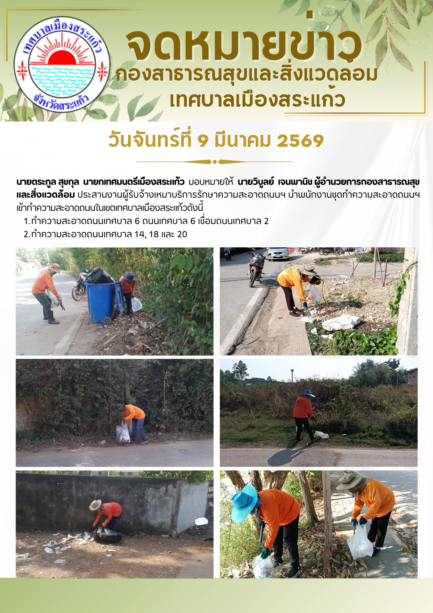 และสิ่งแวดล้อม ประสานงานผู้รับจ้างเหมาบริการรักษาความสะอาดถนนฯ นำพนักงานชุดทำความสะอาดถนนฯ เข้าทำความสะอาดถนนในเขตเทศบาลเมืองสระแก้วดังนี้