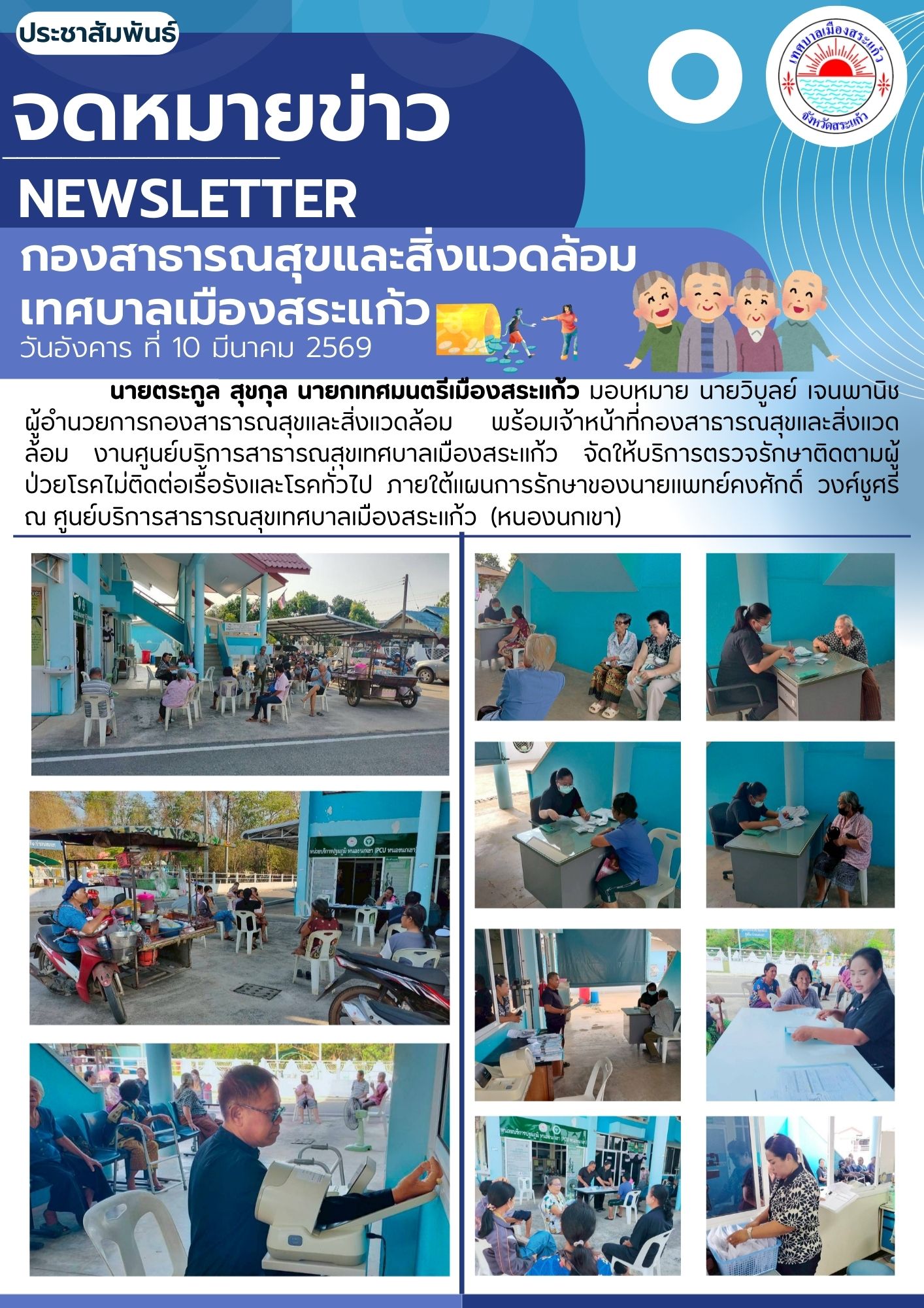 (10 มี.ค. 69) นายตระกูล สุขกุล นายกเทศมนตรีเมืองสระแก้ว มอบหมายนายวิบูลย์ เจนพานิช ผู้อำนวยการกองสาธารณสุขและสิ่งแวดล้อม พร้อมเจ้าหน้าที่กองสาธารณสุขและสิ่งแวดล้อม งานศูนย์บริการสาธารณสุขเทศบาลเมืองสระแก้ว จัดให้บริการตรวจรักษาติดตามผู้ป่วยโรคไม่ติดต่อเรื้อรังและโรคทั่วไป ภายใต้แผนการรักษาของนายแพทย์คงศักดิ์ วงศ์ชูศรี ณ ศูนย์บริการสาธารณสุขเทศบาลเมืองสระแก้ว (หนองนกเขา)