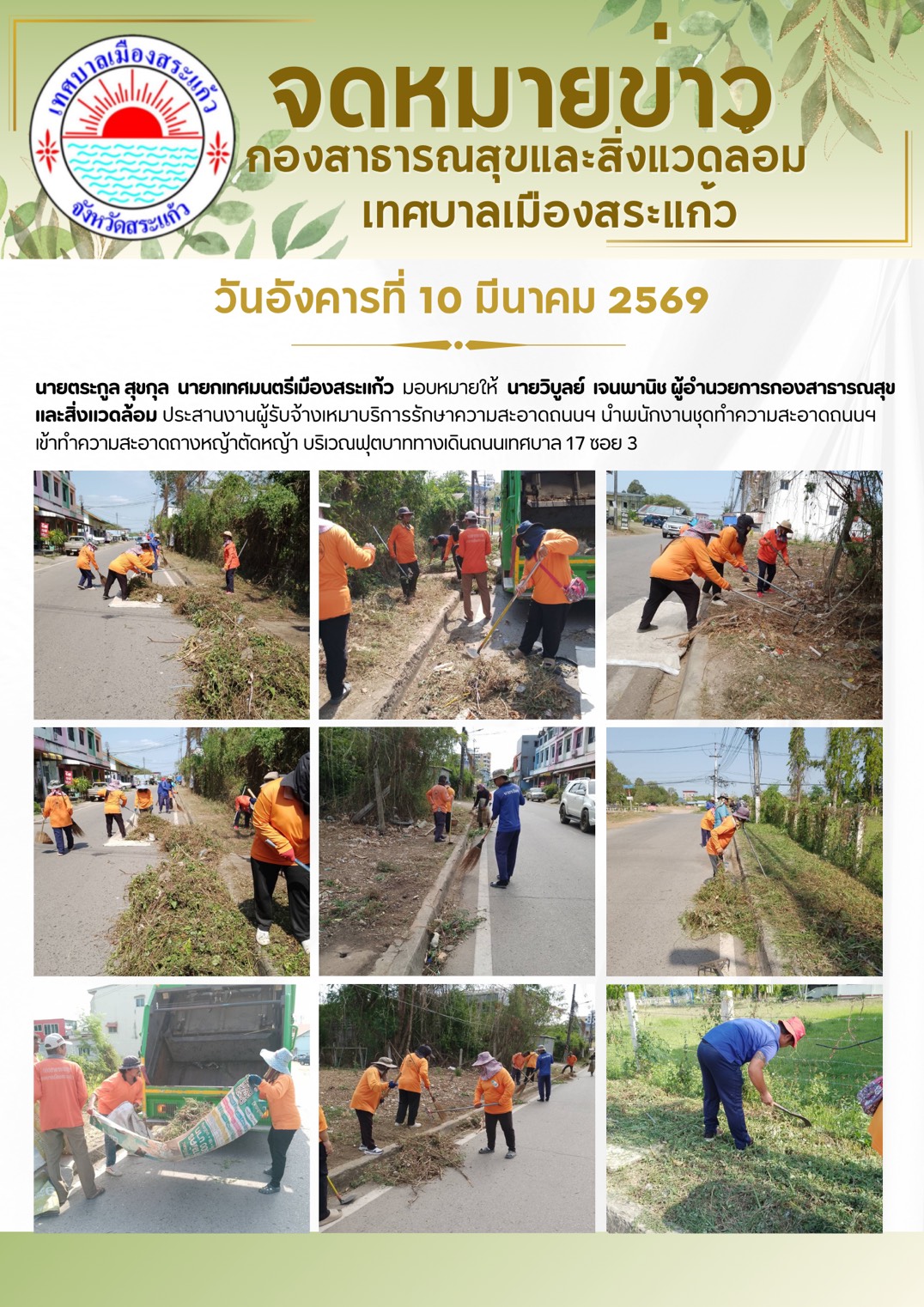 (10 มี.ค. 69) นายตระกูล สุขกุล นายกเทศมนตรีเมืองสระแก้ว มอบหมายให้นายวิบูลย์ เจนพานิช ผู้อำนวยการกองสาธารณสุขและสิ่งแวดล้อม ประสานงานผู้รับจ้างเหมาบริการรักษาความสะอาดถนนฯ นำพนักงานชุดทำความสะอาดถนนฯ เข้าทำความสะอาดถางหญ้าตัดหญ้า บริเวณฟุตบาททางเดินถนนเทศบาล 17 ซอย 3