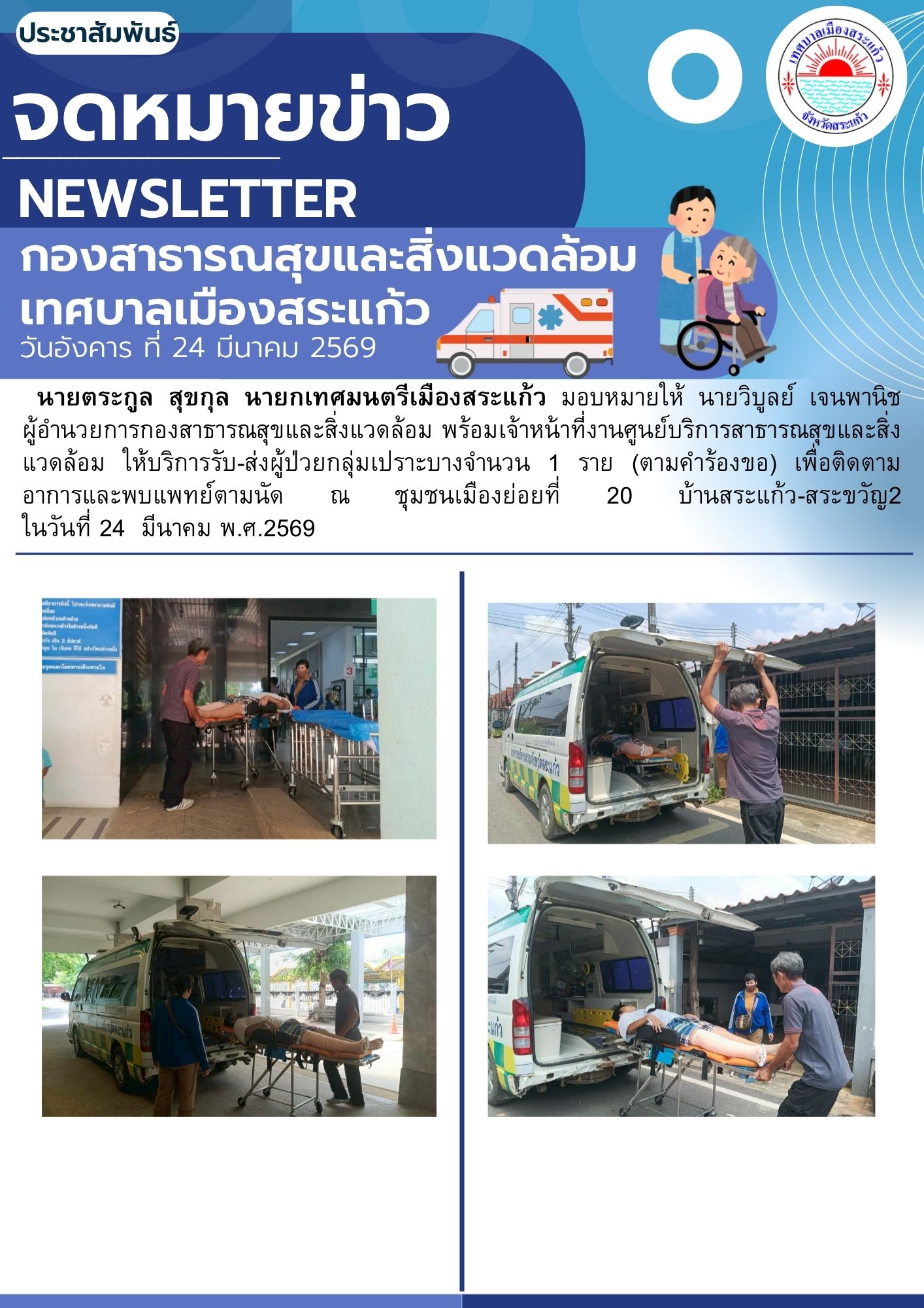 (24 มี.ค. 69) นายตระกูล สุขกุล นายกเทศมนตรีเมืองสระแก้ว มอบหมายให้นายวิบูลย์ เจนพานิช ผู้อำนวยการกองสาธารณสุขและสิ่งแวดล้อม พร้อมเจ้าหน้าที่งานศูนย์บริการสาธารณสุขและสิ่งแวดล้อม ให้บริการรับ-ส่งผู้ป่วยกลุ่มเปราะบาง จำนวน 1 ราย (ตามคำร้องขอ) เพื่อติดตามอาการและพบแพทย์ตามนัด ณ ชุมชนเมืองย่อยที่ 20 (บ้านสระแก้ว - สระขวัญ 2)