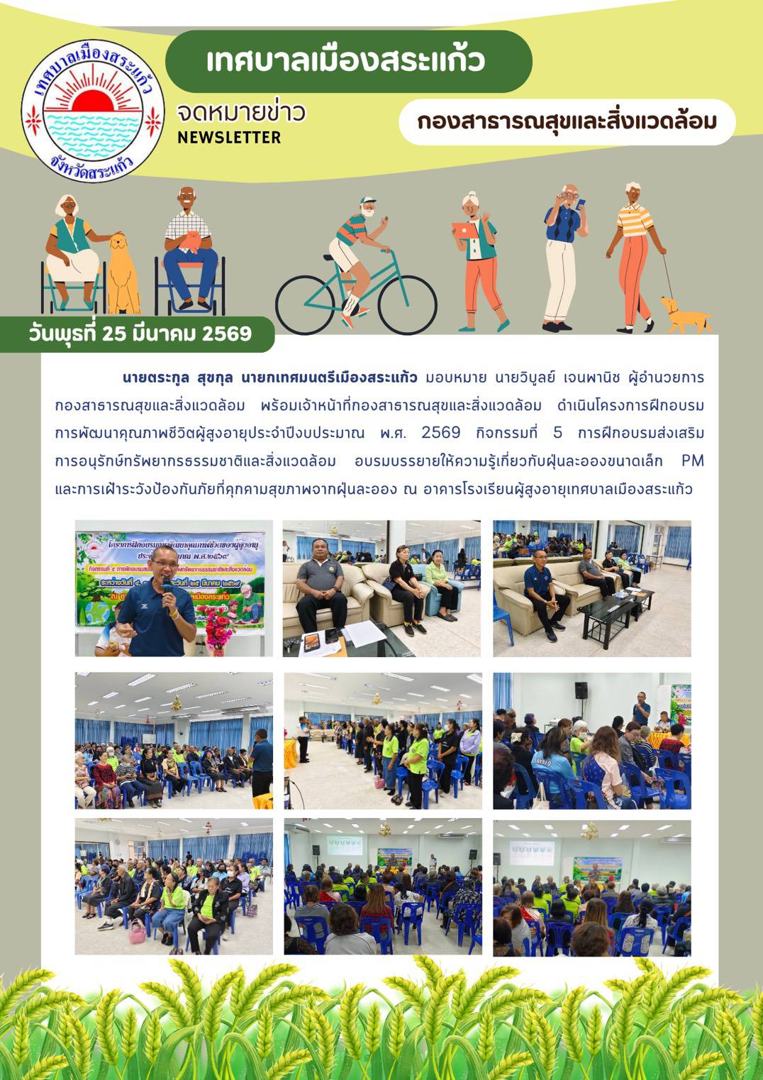 (25 มี.ค. 69) นายตระกูล สุขกุล นายกเทศมนตรีเมืองสระแก้ว มอบหมายให้นายวิบูลย์ เจนพานิช ผู้อำนวยการกองสาธารณสุขและสิ่งแวดล้อม เทศบาลเมืองสระแก้ว ดำเนินโครงการฝึกอบรมการพัฒนาคุณภาพชีวิตผู้สูงอายุ ประจำปีงบประมาณ พ.ศ 2569 กิจกรรมที่ 5 การฝึกอบรมส่งเสริมการอนุรักษ์ทรัพยากรธรรมชาติและสิ่งแวดล้อม อบรมบรรยายให้ความรู้เกี่ยวกับฝุ่นละอองขนาดเล็ก PM และการเฝ้าระวังป้องกันภัยที่คุกคามสุขภาพจากฝุ่นละออง โดยได้รับเกียรติจากนายกองตรีสมยศ สระทอง เป็นวิทยากร ณ อาคารเรียนผู้สูงอายุเทศบาลเมืองสระแก้ว
