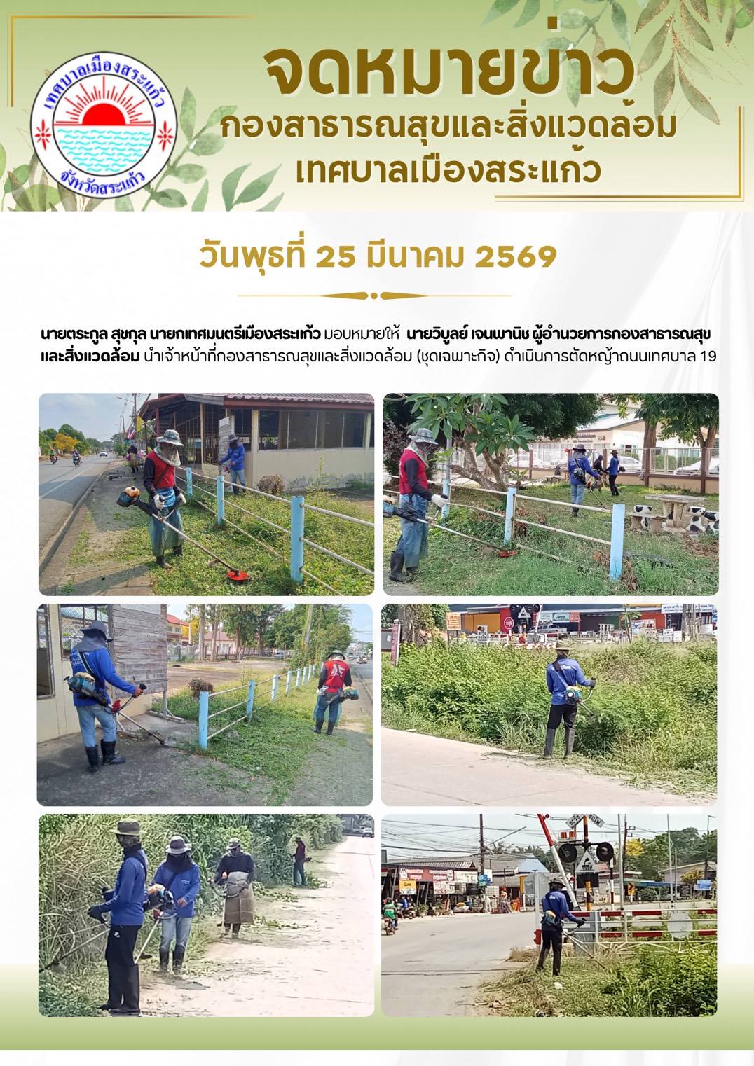 (25 มี.ค. 69) นายตระกูล สุขกุล นายกเทศมนตรีเมืองสระแก้ว มอบหมายให้นายวิบูลย์ เจนพานิช ผู้อำนวยการกองสาธารณสุขและสิ่งแวดล้อม นำเจ้าหน้าที่กองสาธารณสุขและสิ่งแวดล้อม (ชุดเฉพาะกิจ) ดำเนินการตัดหญ้าถนนเทศบาล 19