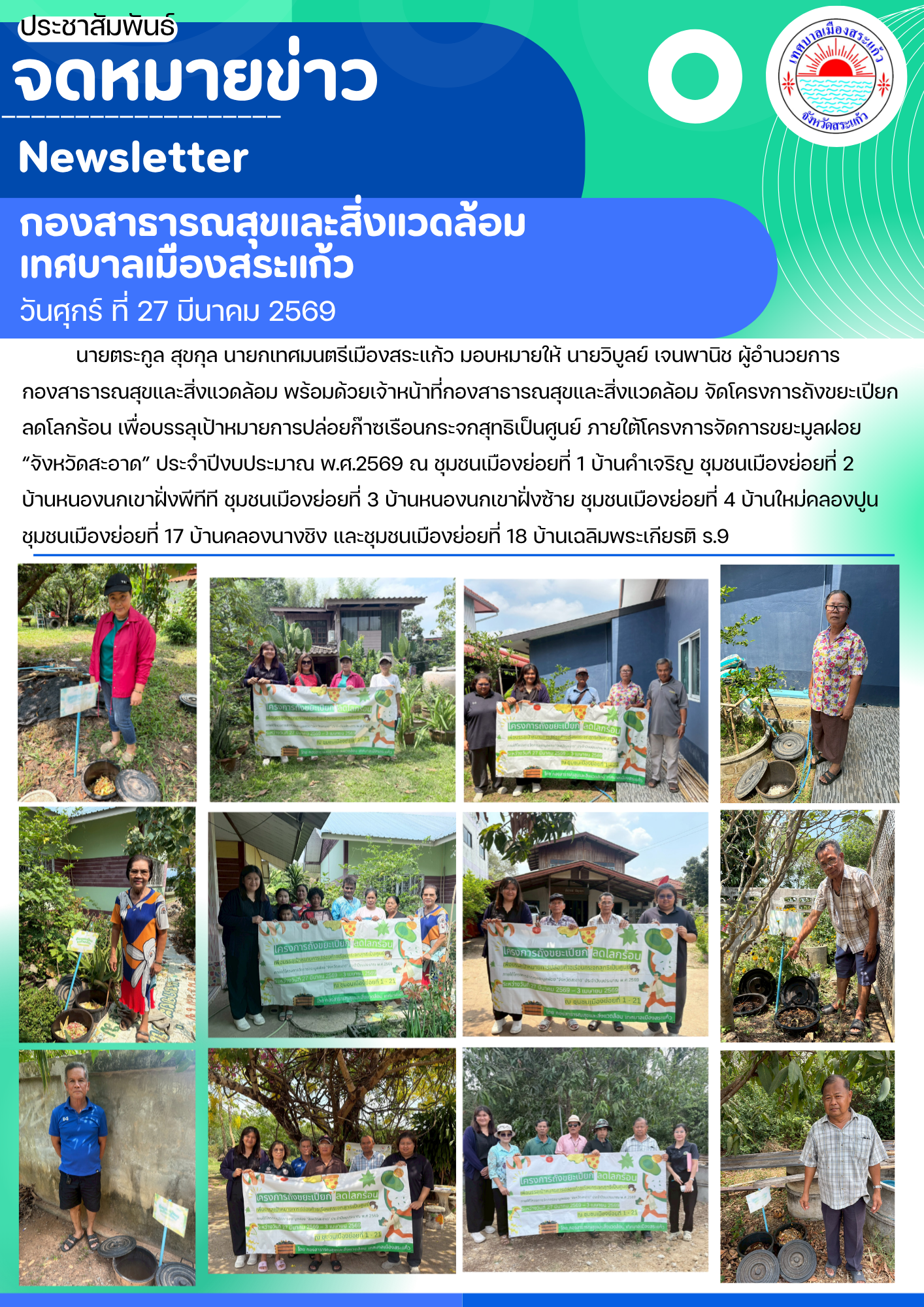 (27 มี.ค. 69) นายตระกูล สุขกุล นายกเทศมนตรีเมืองสระแก้ว มอบหมายให้ นายวิบูลย์ เจนพานิช ผู้อำนวยการกองสาธารณสุขและสิ่งแวดล้อม พร้อมด้วยเจ้าหน้าที่กองสาธารณสุขและสิ่งแวดล้อม จัดโครงการถังขยะเปียก ลดโลกร้อน เพื่อบรรลุเป้าหมายการปล่อยก๊าซเรือนกระจกสุทธิเป็นศูนย์ ภายใต้โครงการจัดการขยะมูลฝอย “จังหวัดสะอาด” ประจำปีงบประมาณ พ.ศ.2569 ณ ชุมชนเมืองย่อยที่ 1 (บ้านคำเจริญ) , ชุมชนเมืองย่อยที่ 2 (บ้านหนองนกเขาฝั่งพีทีที) , ชุมชนเมืองย่อยที่ 3 (บ้านหนองนกเขาฝั่งซ้าย) , ชุมชนเมืองย่อยที่ 4 (บ้านใหม่คลองปูน) , ชุมชนเมืองย่อยที่ 17 (บ้านคลองนางชิง) และชุมชนเมืองย่อยที่ 18 (บ้านเฉลิมพระเกียรติ ร.9)