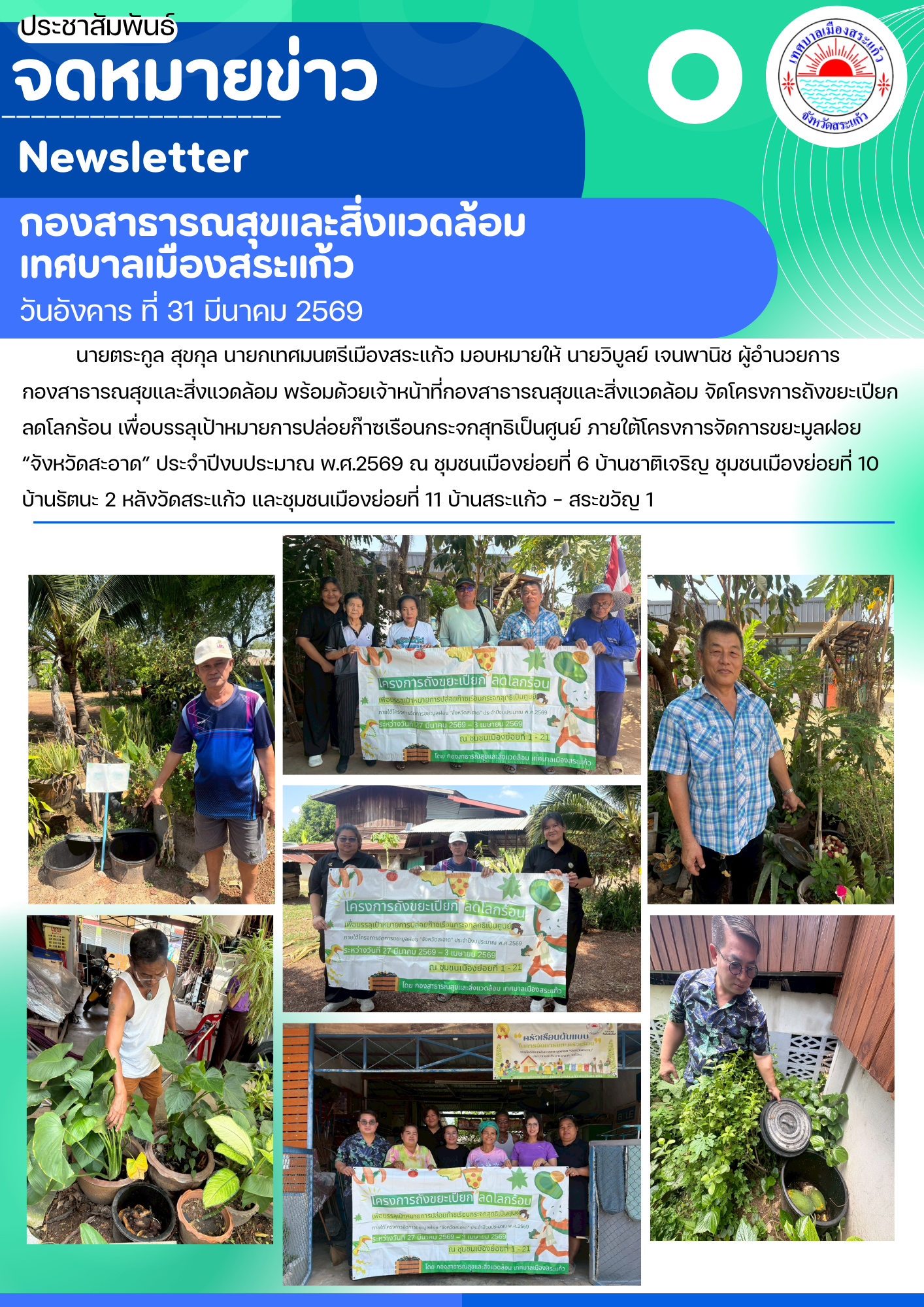 (31 มี.ค. 69) นายตระกูล สุขกุล นายกเทศมนตรีเมืองสระแก้ว มอบหมายให้นายวิบูลย์ เจนพานิช ผู้อำนวยการกองสาธารณสุขและสิ่งแวดล้อม พร้อมด้วยเจ้าหน้าที่กองสาธารณสุขและสิ่งแวดล้อม จัดโครงการถังขยะเปียก ลดโลกร้อน เพื่อบรรลุเป้าหมายการปล่อยก๊าซเรือนกระจกสุทธิเป็นศูนย์ ภายใต้โครงการจัดการขยะมูลฝอย “จังหวัดสะอาด” ประจำปีงบประมาณ พ.ศ.2569 ณ ชุมชนเมืองย่อยที่ 6 (บ้านชาติเจริญ) , ชุมชนเมืองย่อยที่ 10 (บ้านเนินรัตนะ 2) หลังวัดสระแก้ว , และชุมชนเมืองย่อยที่ 11 (บ้านสระแก้ว - สระขวัญ 1)