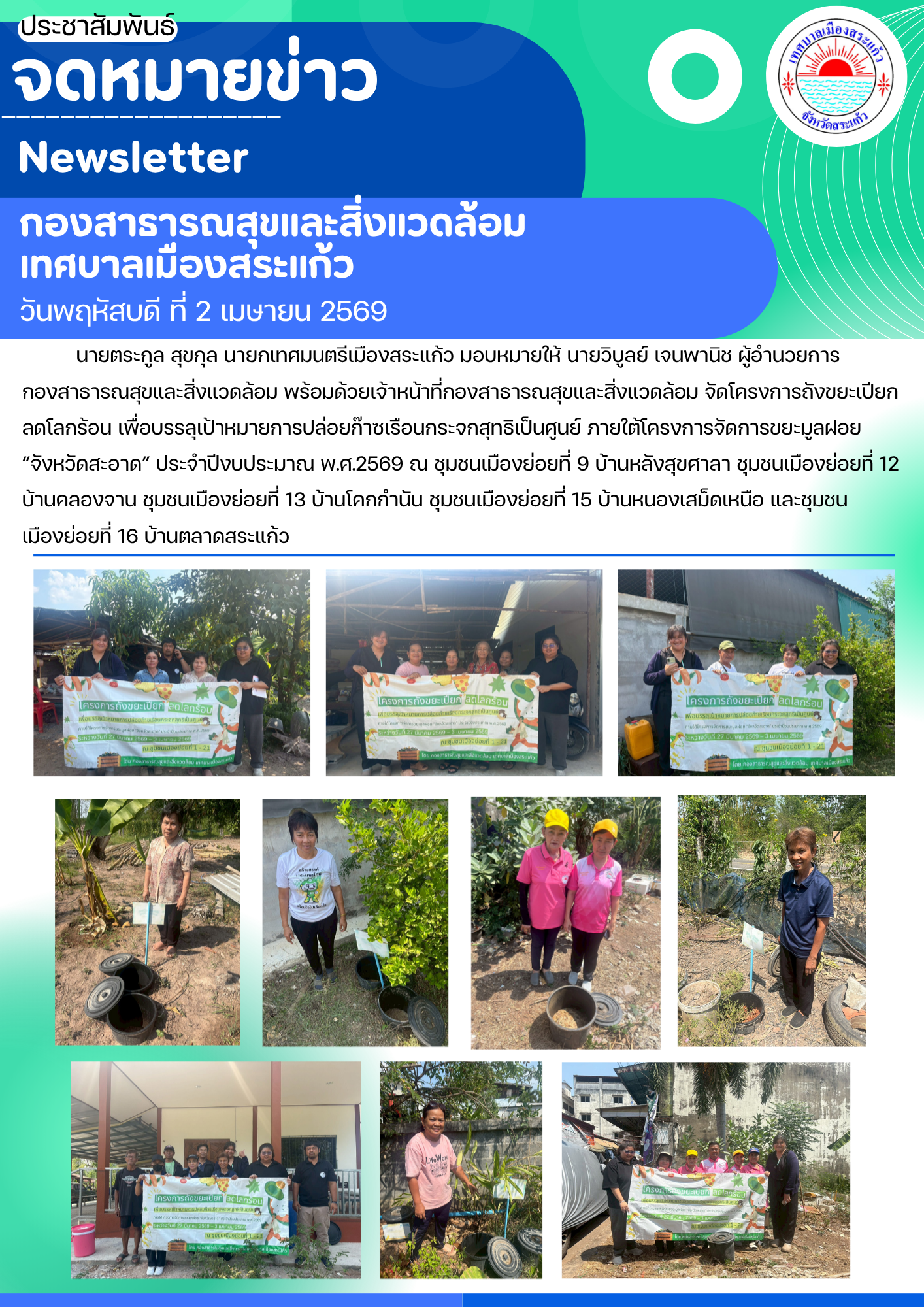 (2 เม.ย. 69) นายตระกูล สุขกุล นายกเทศมนตรีเมืองสระแก้ว มอบหมายให้นายวิบูลย์ เจนพานิช ผู้อำนวยการกองสาธารณสุขและสิ่งแวดล้อม พร้อมด้วยเจ้าหน้าที่กองสาธารณสุขและสิ่งแวดล้อม จัดโครงการถังขยะเปียก ลดโลกร้อน เพื่อบรรลุเป้าหมายการปล่อยก๊าซเรือนกระจกสุทธิเป็นศูนย์ ภายใต้โครงการจัดการขยะมูลฝอย “จังหวัดสะอาด” ประจำปีงบประมาณ พ.ศ.2569 ณ ชุมชนเมืองย่อยที่ 9 (บ้านหลังสุขศาลา) , ชุมชนเมืองย่อยที่ 12 (บ้านคลองจาน) , ชุมชนเมืองย่อยที่ 13 (บ้านโคกกำนัน) , ชุมชนเมืองย่อยที่ 15 (บ้านหนองเสม็ดเหนือ) และชุมชนเมืองย่อยที่ 16 บ้านตลาดสระแก้ว