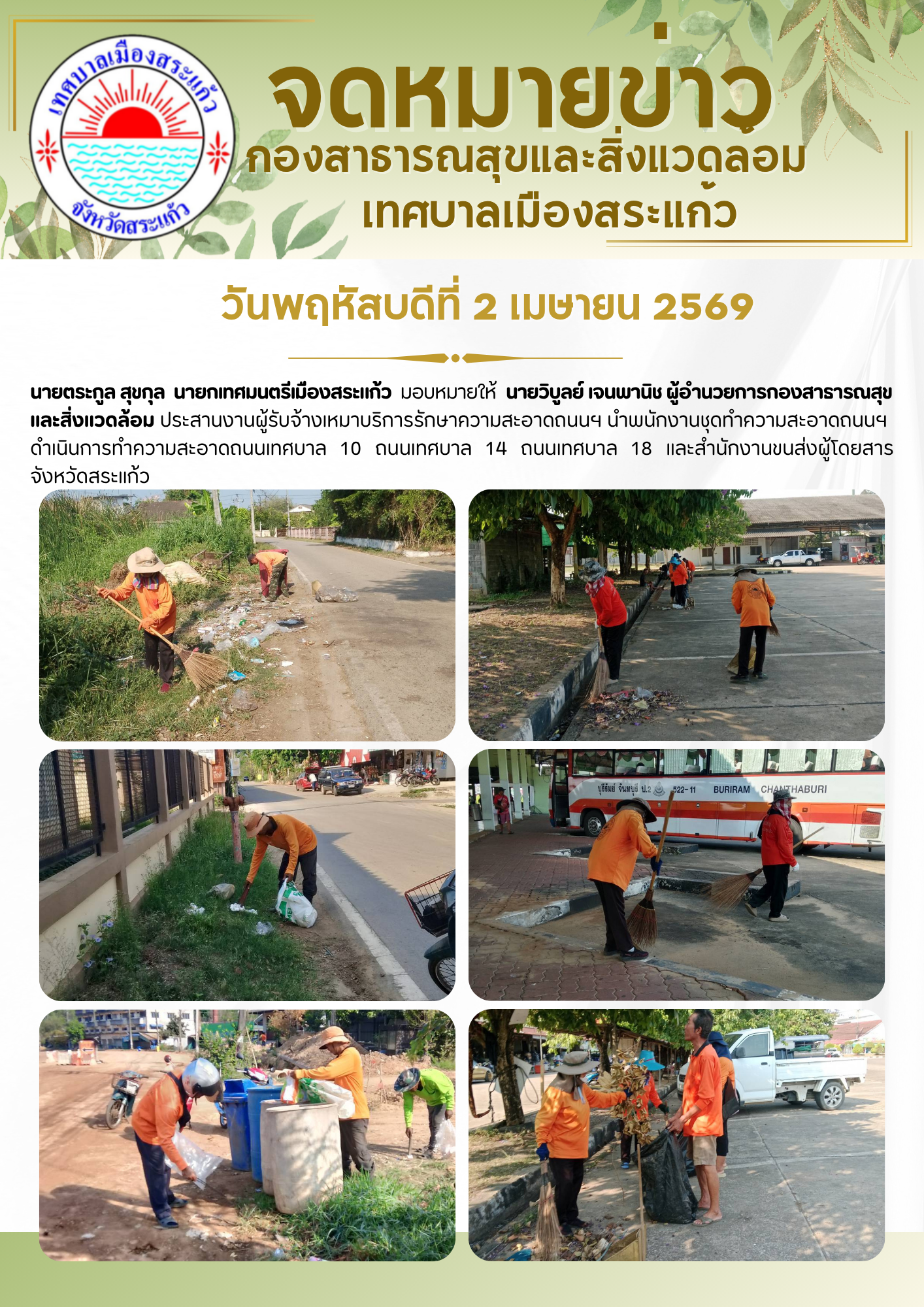 (2 เม.ย. 69) นายตระกูล สุขกุล นายกเทศมนตรีเมืองสระแก้ว มอบหมายให้นายวิบูลย์ เจนพานิช ผู้อำนวยการกองสาธารณสุขและสิ่งแวดล้อม ประสานงานผู้รับจ้างเหมาบริการรักษาความสะอาดถนนฯ นำพนักงานชุดทำความสะอาดถนนฯ ดำเนินการทำความสะอาดถนนเทศบาล 10 , ถนนเทศบาล 14 , ถนนเทศบาล 18 และสำนักงานขนส่งผู้โดยสารจังหวัดสระแก้ว